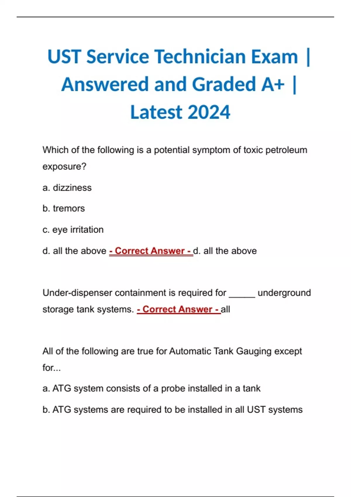 UST Service Technician Exam | Answered and Graded A+ | Latest 2024 UST Service Technician Exam | Answered and Graded A+ | Latest 2024 UST Service Technician Exam | Answered and Graded A+ | Latest 2024