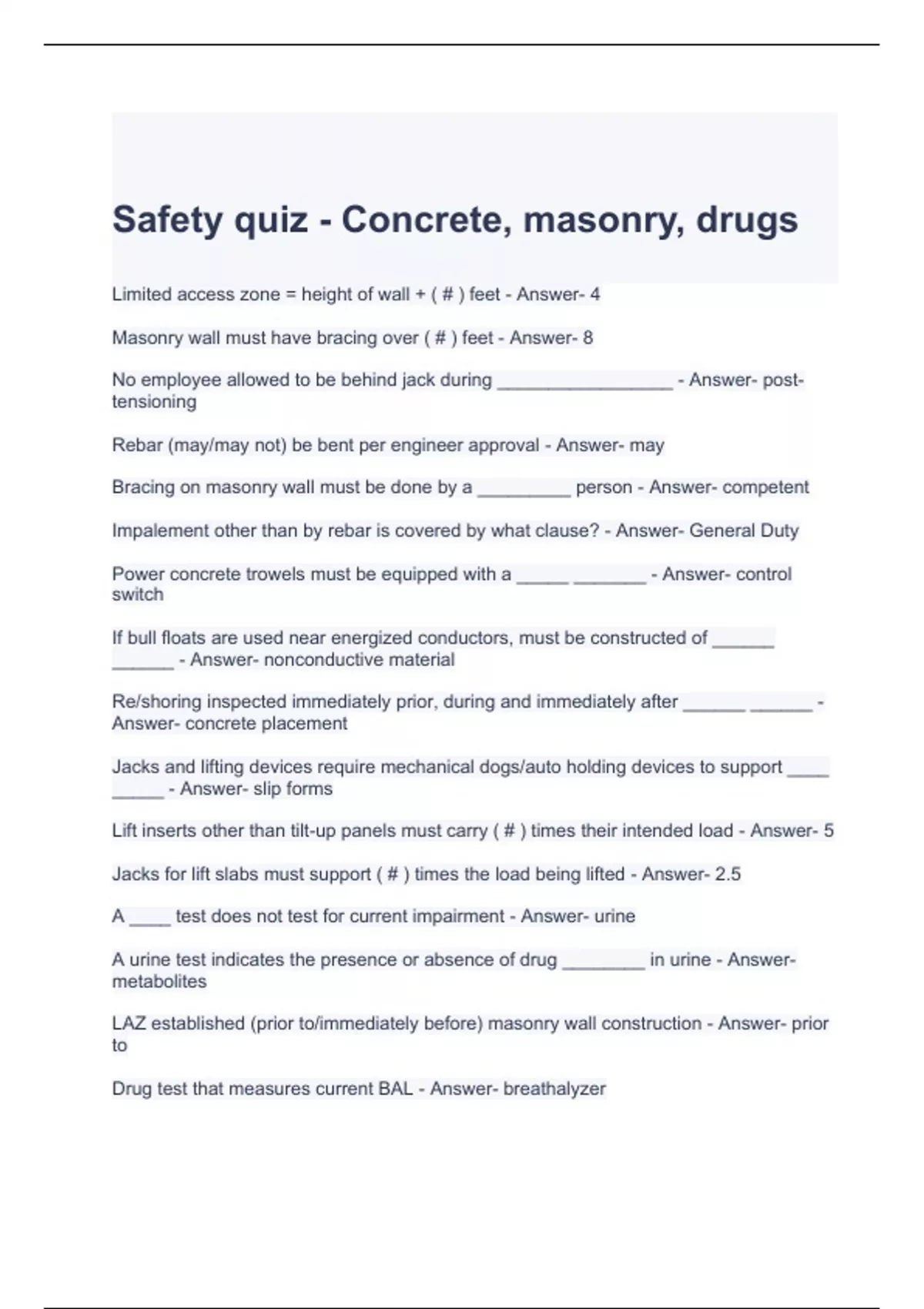 Safety quiz - Concrete, masonry, drugs with correct answers