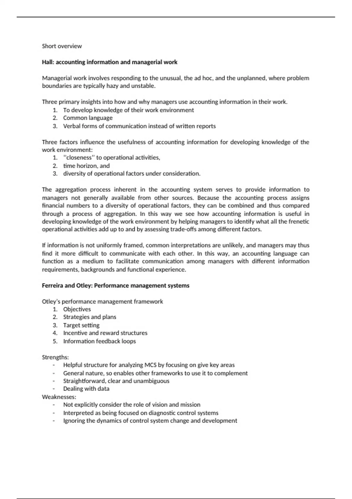 Note: this is a short overview of the important information of all articles. Hall, Ferreira and Otley, Malmi and Brown, van de Ven and Johnson, Malmi and Granlund, Tucker and Lowe, van der Volk et al., Choi et al., Speklé and Verbeeten, van Triest et al., Pfister and Lukka, Jansen et al., Malmi et al., Brandau et al., Goretzki et al., Janin, Horton and Wanderley