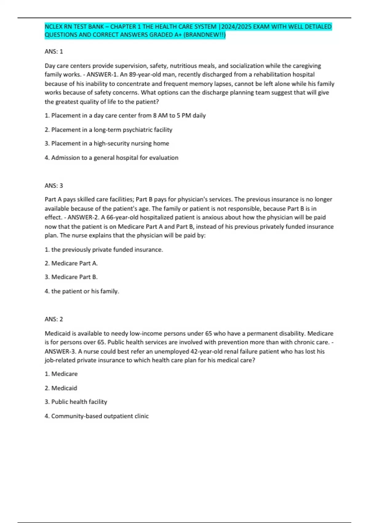 ANS: 1 Day care centers provide supervision, safety, nutritious meals, and socialization while the caregiving family works. - ANSWER-1. An 89-year-old man, recently discharged from a rehabilitation hospital because of his inability to concentrate and frequent memory lapses, cannot be left alone while his family works because of safety concerns. What options can the discharge planning team suggest that will give the greatest quality of life to the patient? 1. Placement in a day care center from 8 AM to 5 PM daily 2. Placement in a long-term psychiatric facility 3. Placement in a high-security nursing home 4. Admission to a general hospital for evaluation ANS: 3 Part A pays skilled care facilities; Part B pays for physician's services. The previous insurance is no longer available because of the patient's age. The family or patient is not responsible, because Part B is in effect. - ANSWER-2. A 66-year-old hospitalized patient is anxious about how the physician will be paid now that the patient is on Medicare Part A and Part B, instead of his previous privately funded insurance plan. The nurse explains that the physician will be paid by: 1. the previously private funded insurance. 2. Medicare Part A. 3. Medicare Part B. 4. the patient or his family