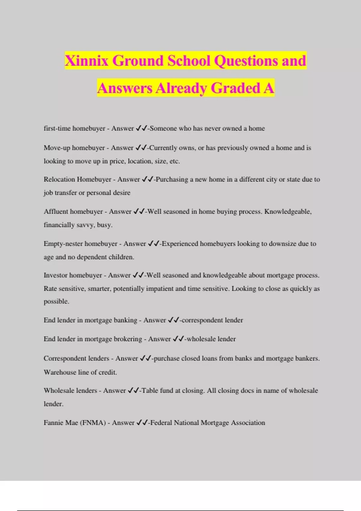 Xinnix Ground School Questions and Answers Already Graded A first-time homebuyer - Answer ️️ -Someone who has never owned a home Move-up homebuyer - Answer ️️ -Currently owns, or has previously owned a home and is looking to move up in price, location, size, etc. Relocation Homebuyer - Answer ️️ -Purchasing a new home in a different city or state due to job transfer or personal desire Affluent homebuyer - Answer ️️ -Well seasoned in home buying process. Knowledgeable, financially savvy, busy. Empty-nester homebuyer - Answer ️️ -Experienced homebuyers looking to downsize due to age and no dependent children. Investor homebuyer - Answer ️️ -Well seasoned and knowledgeable about mortgage process. Rate sensitive, smarter, potentially impatient and time sensitive. Looking to close as quickly as possible. End lender in mortgage banking - Answer ️️ -correspondent lender End lender in mortgage brokering - Answer ️️ -wholesale lender Correspondent lenders - Answer ️️ -purchase closed loans from banks and mortgage bankers. Warehouse line of credit. Wholesale lenders - Answer ️️ -Table fund at closing. All closing docs in name of wholesale lender. Fannie Mae (FNMA) - Answer ️️ -Federal National Mortgage Association Freddie Mac (FHLMC) - Answer ️️ -Federal Home Loan Mortgage Corporation FHA - Answer ️️ -Federal Housing Administration VA - Answer ️️ -Veteran's Administration Non-agency loans - Answer ️️ -Comprise any loans not made by the 4 lending agencies Conforming loans - Answer ️️ -Any agency loan Jumbo loan - Answer ️️ -Any conventional loan that is in excess of the loan limits set by Fannie Mae and Freddie Mac. All jumbo loans are, by definition, nonconforming; the reverse, however, is not true. Conventional - Answer ️️ -A loan NOT insured by FHA or VA Non-conforming - Answer ️️ -Any loan that does NOT conform to Freddie Mac or Fannie Mae guidelines URLA - Answer ️️ -Uniform residential loan application. 1003. Construction loan - Answer ️️ -A short-term, interim loan for financing the cost of construction. The lender makes payments to the builder at periodic intervals as the work progresses. Construction-permanent loan - Answer ️️ -Same as Construction loan except that long-term financing replaces the interim financing upon home completion. Primary residence (owner-occupied, principal residence) - Answer ️️ -Residence that the owner physically occupies Secondary residence (second home) - Answer ️️ -Property purchased for occupancy but not considered primary residence. Such as a vacatio