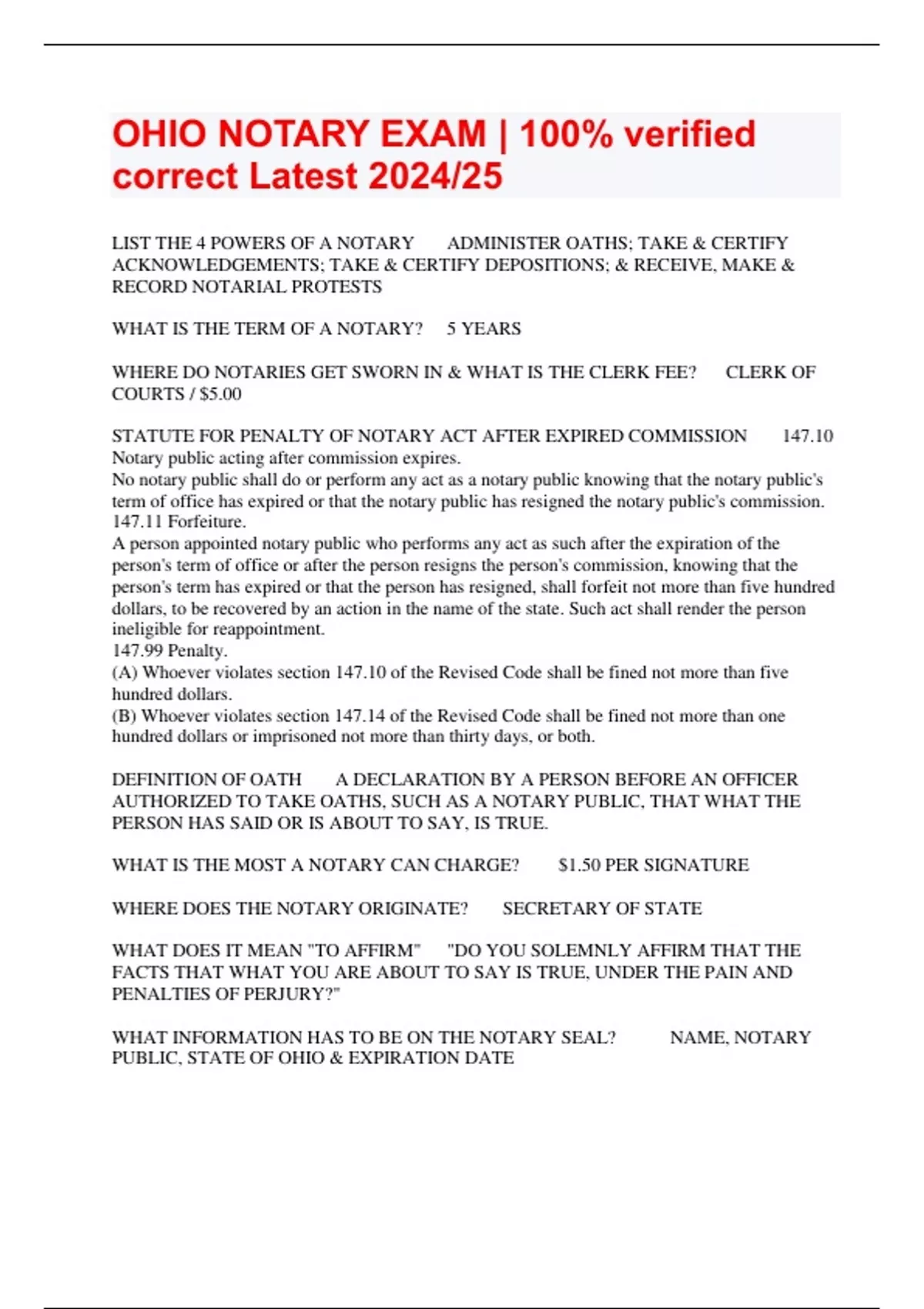 OHIO NOTARY EXAM | 100% verified correct Latest 2024/25