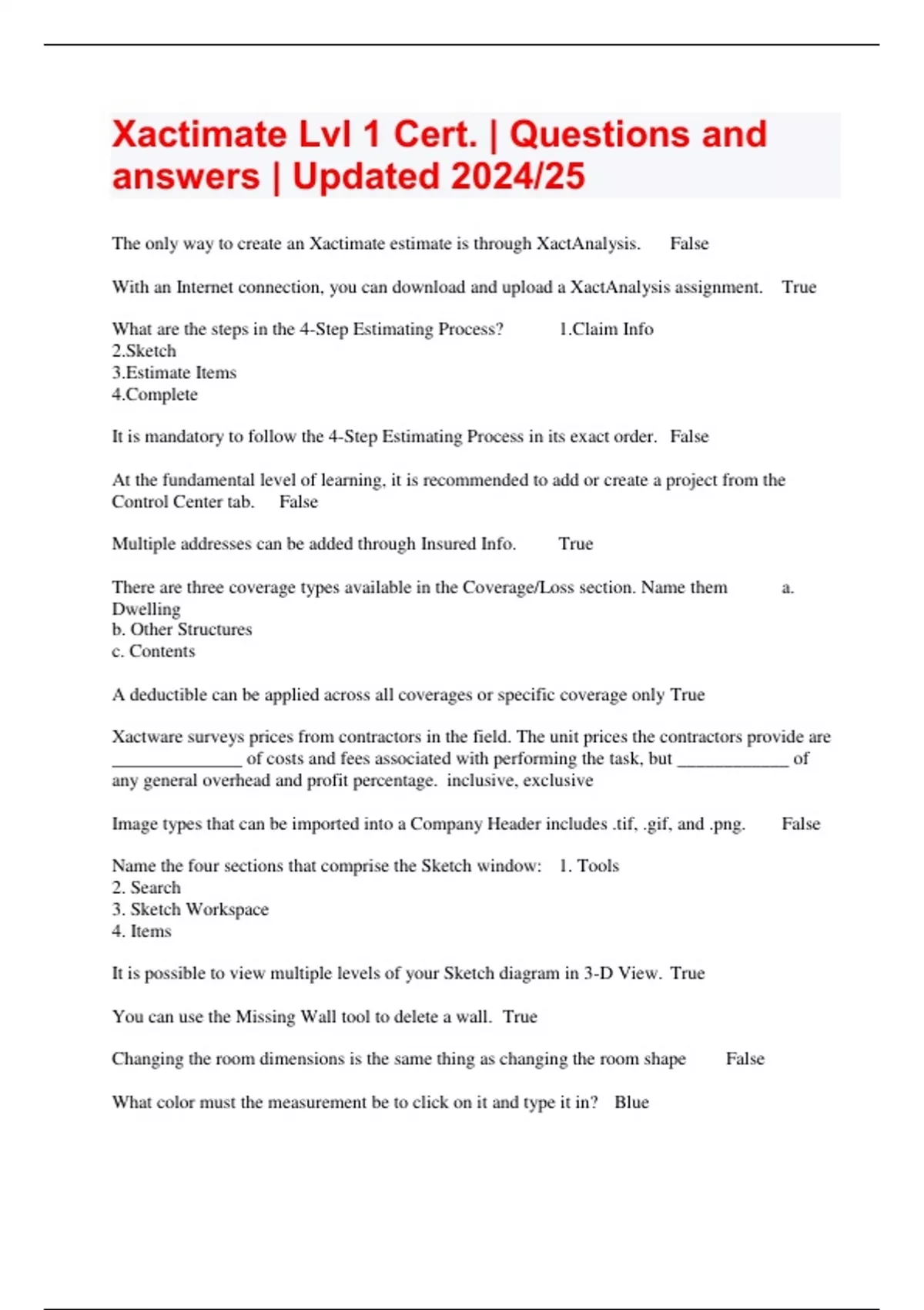 Xactimate Lvl 1 Cert. | Questions and answers | Updated 2024/25