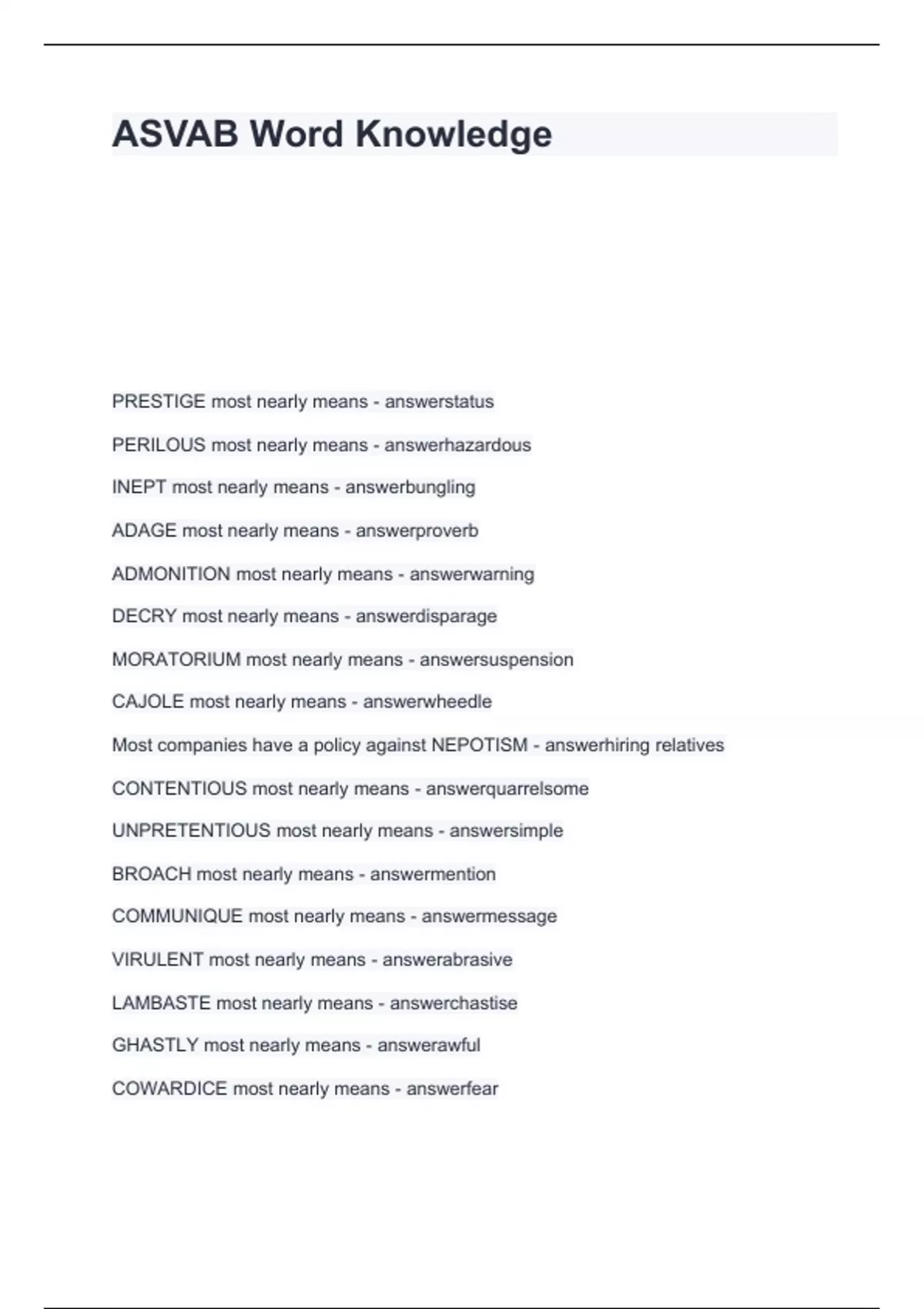 ASVAB Word Knowledge 2024 A questions with solutions