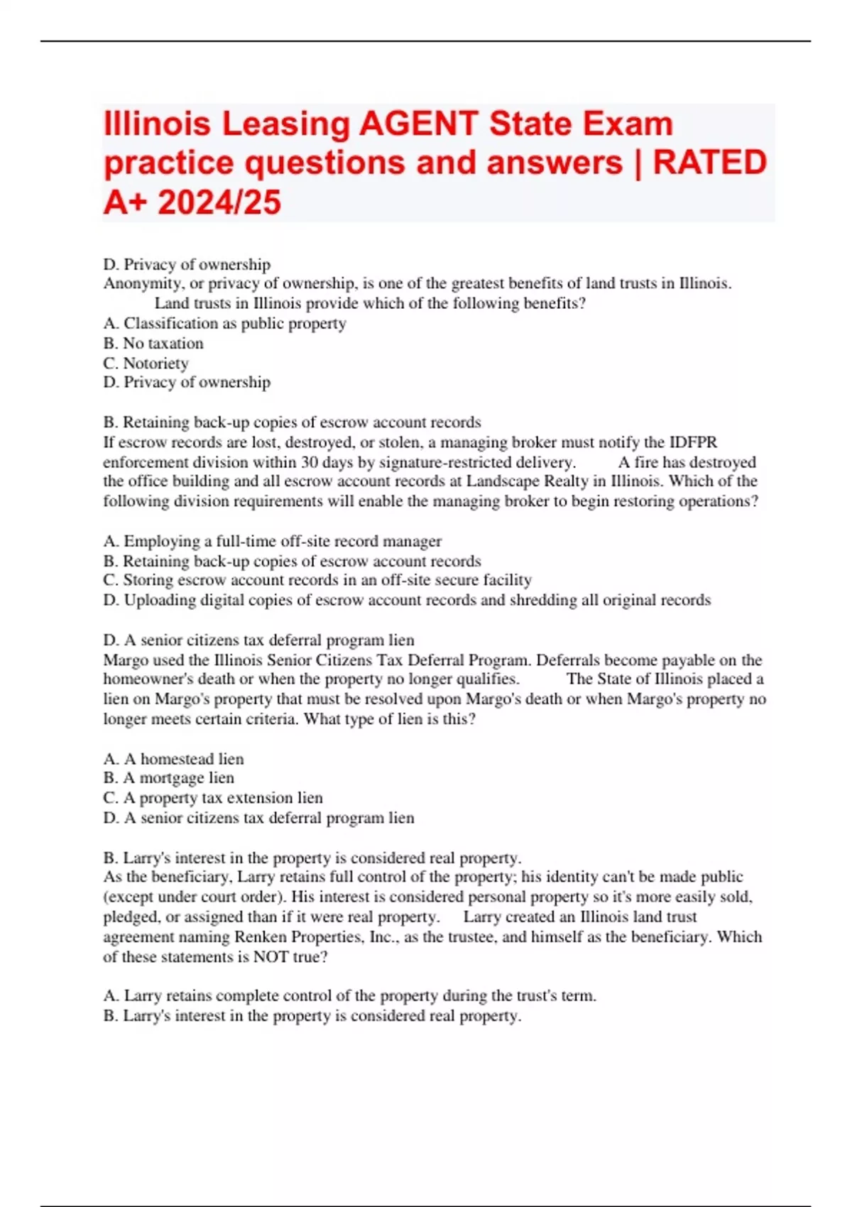 Illinois Leasing AGENT State Exam practice questions and answers | RATED A+ 2024/25
