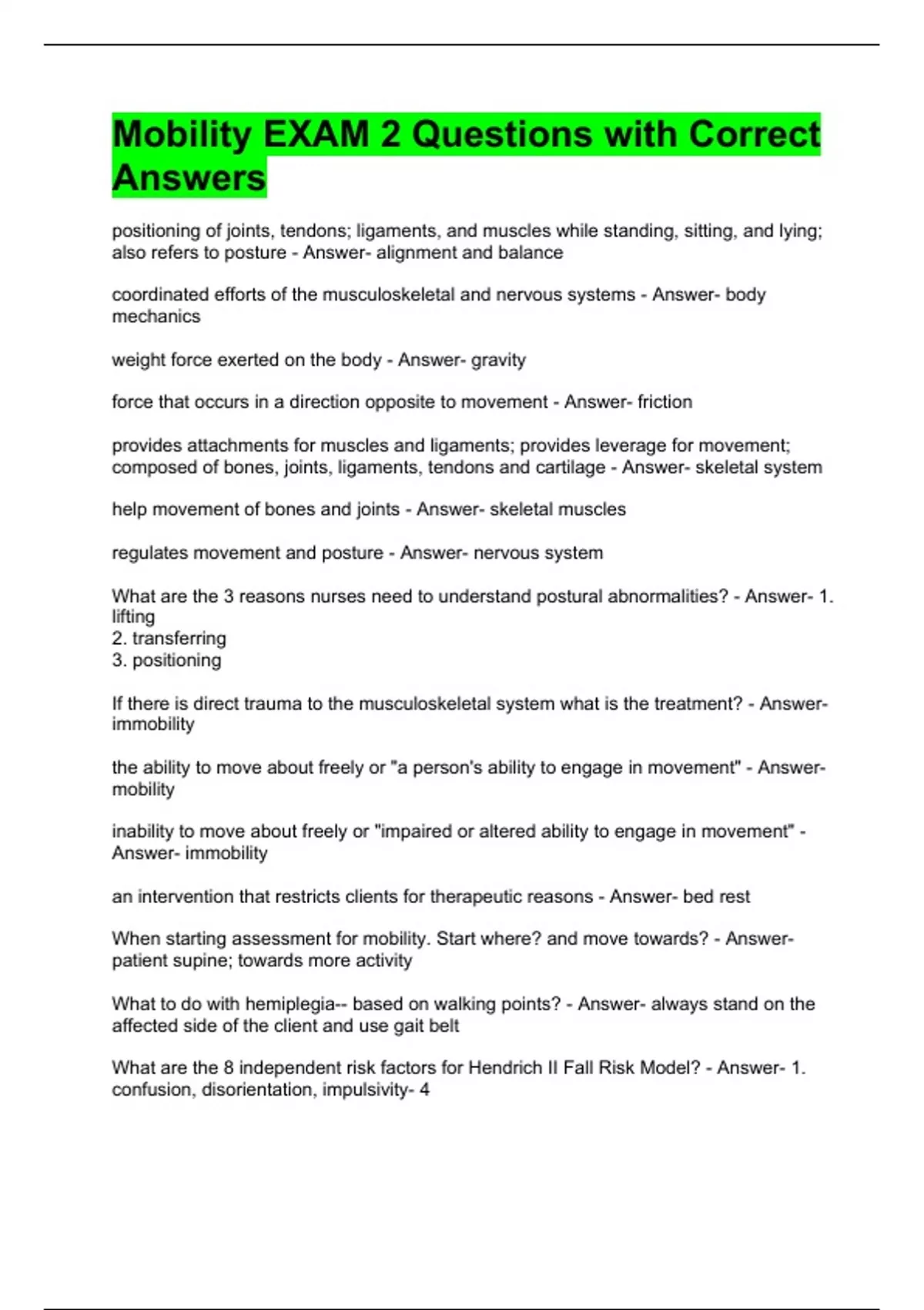 Mobility EXAM 2 Questions with Correct Answers Explain the Get Up and Go Test - Answer- 1. able to rise in a single movement- no loss of balance with steps -0 2. pushes up, successful in one attempt- 1 3. multiple attempts, but successful- 3 4. unable to rise without assistance during test (OR if a medical order states the same and/or complete bed rest is ordered)- 4 Combining the results of the Hendrich II Fall Risk Model and the Get Up & Go Test what score depicts high risk? - Answer- score of 5 or greater what are the 6 elements of fall risk reduction program? - Answer- 1. assess and reassess fall risk in all patients 2. maintaining a safe environment -extrinsic factors 3. monitoring gait and mobility 4. enabling safe toileting 5. educating the family and patient 6. using interdisciplinary team management- may need to get other disciplines involved such as pharmacy, PT, nutrition and social work 4 steps to do when a fall occurs - Answer- 1. Assessment: vitals, LOC, check for shortening of extremity, pain. If numbness or tingling in extremities, back pain, rib pain or externally rotated or shortened leg. DO NOT MOVE if possible; call for ambulance 2. notify health care provider and family 3. if no acute warning signs, continue frequent neuro checks and vital signs- checking for development of subdural hematoma 4. documentation and analysis - was fall preventable? Guidelines for musculoskeletal injuries among health care workers? - Answer- 1. keep weight to be lifted as close to body as possible 2. bend at the knees to maintain center of gravity and use stronger leg muscles to do lifting 3. tighten abdominal muscles and tuck the pelvis to provide balance and protect the back