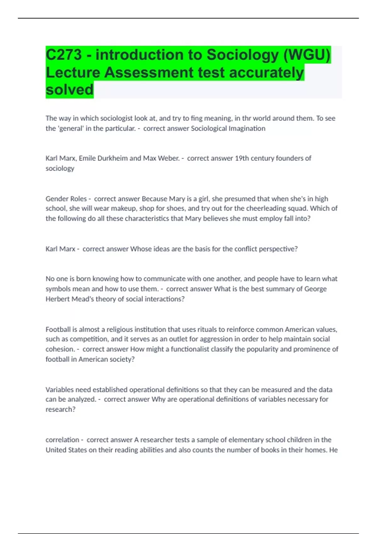 C273 - introduction to Sociology (WGU) Lecture Assessment test accurately solved The way in which sociologist look at, and try to fing meaning, in thr world around them. To see the 'general' in the particular. - correct answer Sociological Imagination Karl Marx, Emile Durkheim and Max Weber. - correct answer 19th century founders of sociology Gender Roles - correct answer Because Mary is a girl, she presumed that when she's in high school, she will wear makeup, shop for shoes, and try out for the cheerleading squad. Which of the following do all these characteristics that Mary believes she must employ fall into? Karl Marx - correct answer Whose ideas are the basis for the conflict perspective? No one is born knowing how to communicate with one another, and people have to learn what symbols mean and how to use them. - correct answer What is the best summary of George Herbert Mead's theory of social interactions?