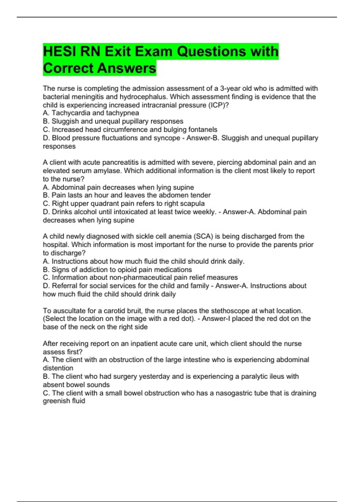 HESI RN Exit Exam Questions with Correct Answers Which self care measure is most important for the nurse to include in the plan of care of a client recently diagnosed with type 2 diabetes mellitus? A. Self-injection techniques B. Blood glucose monitoring C. Diabetic diet meal planning D. A realistic exercise plan - Answer-B. Blood glucose monitoring A client who gave birth 48 hours ago has decided to bottle feed the infant. During the assessment, the nurse observes that both breasts are swollen, warm, and tender on palpation. Which instruction should the nurse provide? A. Apply ice to the breasts for comfort B. Wear a loose-fitting bra during the day to prevent nipple irritation C. Run warm water over breasts D. Express small amounts of milk from the breasts to relieve pressure - Answer-A. Apply ice to the breasts for comfort The nurse is preparing a client who had a below-the-knee (BKA) amputation for discharge to home. Which recommendations should the nurse provide this client? (Select all that apply) A. Avoid range of motion exercises B. Use a residual limb shrinker C. Apply alcohol to the stump after bathing D. Inspect skin for redness E. Wash the stump with soap and water - Answer-B. Use a residual limb shrinker D. Inspect skin for redness E. Wash the stump with soap and water A toddler presenting with a history of intermittent skin rashes, hives, abdominal pain, and vomiting that occurs after ingesting of milk products arrives to the clinic accompanied by the parents. Which type of testing should the nurse provide education to the toddler's family about? A. Serum immunoglobulin E (IgE) B. Intradermal test C. Atopy patch test D. Placebo-controlled food challenge - Answer-A. Serum immunoglobulin E (IgE) A client who is scheduled for a bronchoscopy in the morning is anxious and asking the nurse numerous questions about the procedure. In preparing the client for the procedure, which intervention has the highest priority? A. Allow client to gargle with warm salt water B. Administer a sedative to alleviate anxiety C. Instruct client to write down the questions D. Deny client's request for a midnight snack - Answer-C. Instruct client to write down the questions