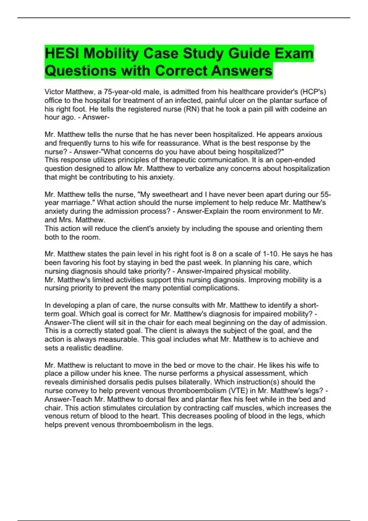 HESI Mobility Case Study Guide Exam Questions with Correct Answers