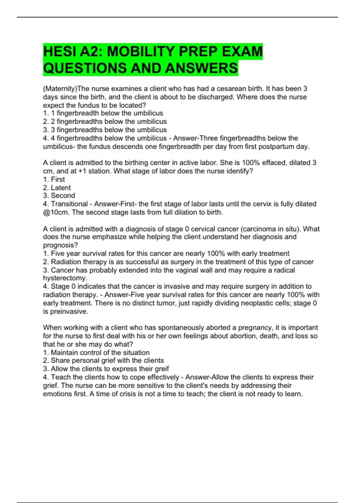 HESI A2: MOBILITY PREP EXAM QUESTIONS AND ANSWERS A client's membranes rupture while her labor is being augmented with an oxytocin infusion. The nurse observes variable decelerations in the fetal heart rate on the fetal monitor strip. Which action should the nurse initiate next? 1. Changing the client's position 2. Taking the client's blood pressure 3. Stopping the client's oxytocin infusion 4. Preparing the client for an immediate birth - Answer-Changing the client's position because decels are usually the result of cord compression; a change in position will relieve the pressure on the cord. During her first visit to the prenatal clinic a client is found to be obese. During the ensuing 5 months, the client has been unsuccessful in adhering to her nutritional plan. Which finding indicates to the nurse that the client has been successful during the sixth month? 1. Weight loss of 1lb 2. Weight gain of 2lb 3. No weight change from the last month 4. The client's statement that she lost weight last week - Answer-Weight gain of 2lb because the client needs to gain some weight to meet the fetus' nutritional needs and 2lb of weight gain is appropriate. Weight loss is contraindicated in pregnancy because it may interfere with fetal G&D A nurse administers two serial intramuscular injections of betamethasone to a woman at 32 weeks gestation who has been admitted in preterm labor. The nurse knows that this medication is given to accomplish what purpose? 1. Stop the process of labor 2. Increase placental perfusion 3. Stimulate surfactant production 4. Reduce intensity of contractions - Answer-Stimulate surfactant production because betamethasone is a corticosteroid. A nurse is providing dietary counseling to a client at 14 weeks' gestation. The client is a recent immigrant from Asia, and the nurse explores the foods that the client usually eats. Which foods should the nurse counsel the client to avoid during pregnancy? Select all that apply. 1. Yogurt 2. Oily Fish 3. Apricots 4. Raw Shellfish 5. Herbal Supplements 6. Soft-scrambled Eggs - Answer-4, 5, & 6 (Raw Shellfish, Herbal Supplements, and Soft-scrambled Eggs)