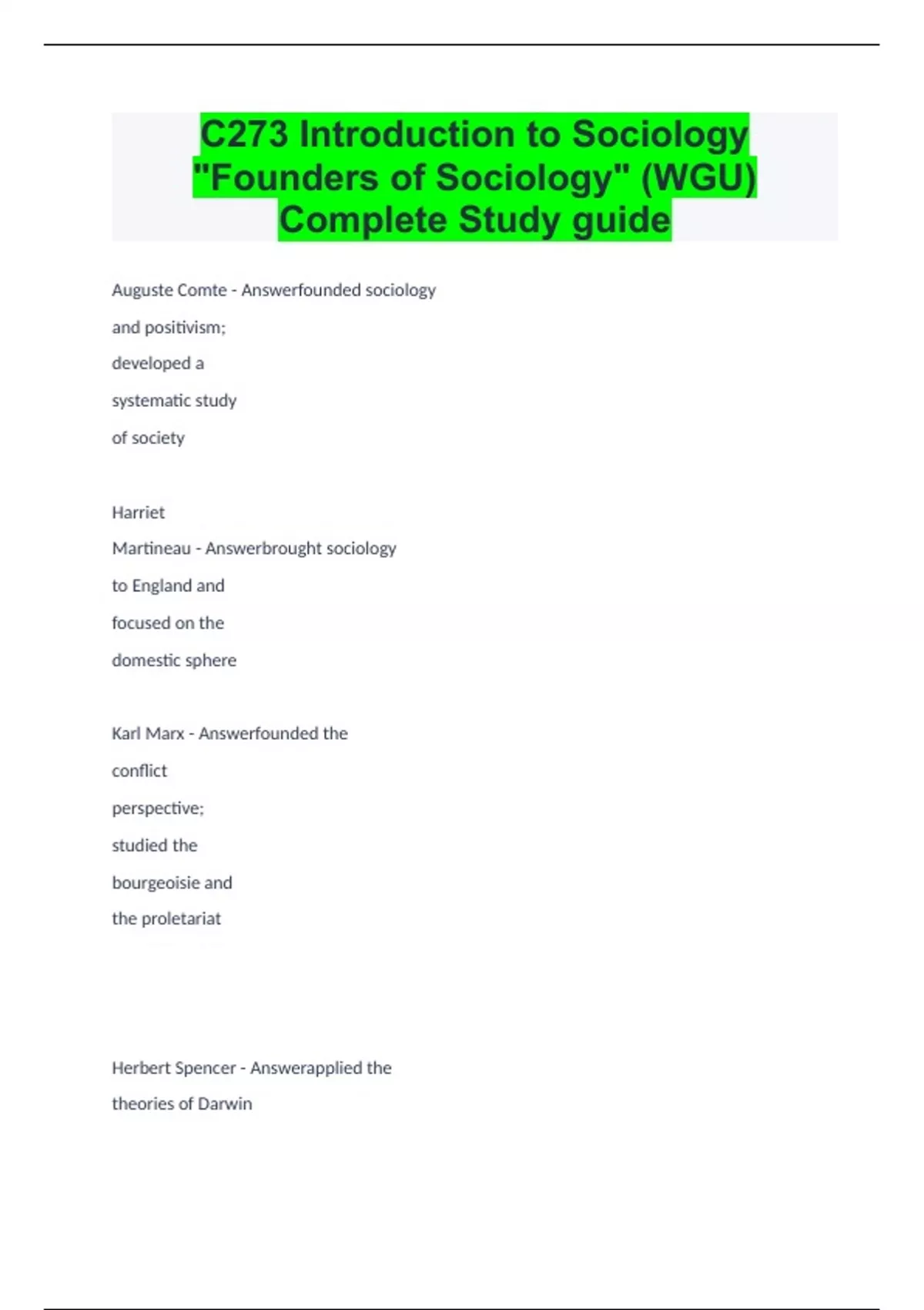 C273 Introduction to Sociology "Founders of Sociology" (WGU) Complete Study guide Auguste Comte - Answerfounded sociology and positivism; developed a systematic study of society Harriet Martineau - Answerbrought sociology to England and focused on the domestic sphere Karl Marx - Answerfounded the conflict perspective; studied the bourgeoisie and the proletariat Herbert Spencer - Answerapplied the theories of Darwin to societies; survival of the fittest Emile Durkheim - Answerdescribed the social bonds that connect societies as either mechanical solidarity or organic solidarity; wrote about social facts as external influences on how people behave Jane Addams - Answerfocused on improving issues of child labor, working hours, industrial safety and women's rights; helped found the ACLU Max Weber - Answerfocused on bureaucracies and the rationalization of society; wrote The Protestant Ethic and the Spirit of Capitalism- disagreed with Karl Marx. W. E. B. DuBois - Answercoined the term "double consciousness" and wrote about African American social identities and experiences; the first African American to earn a doctorate from Harvard University- Twoness