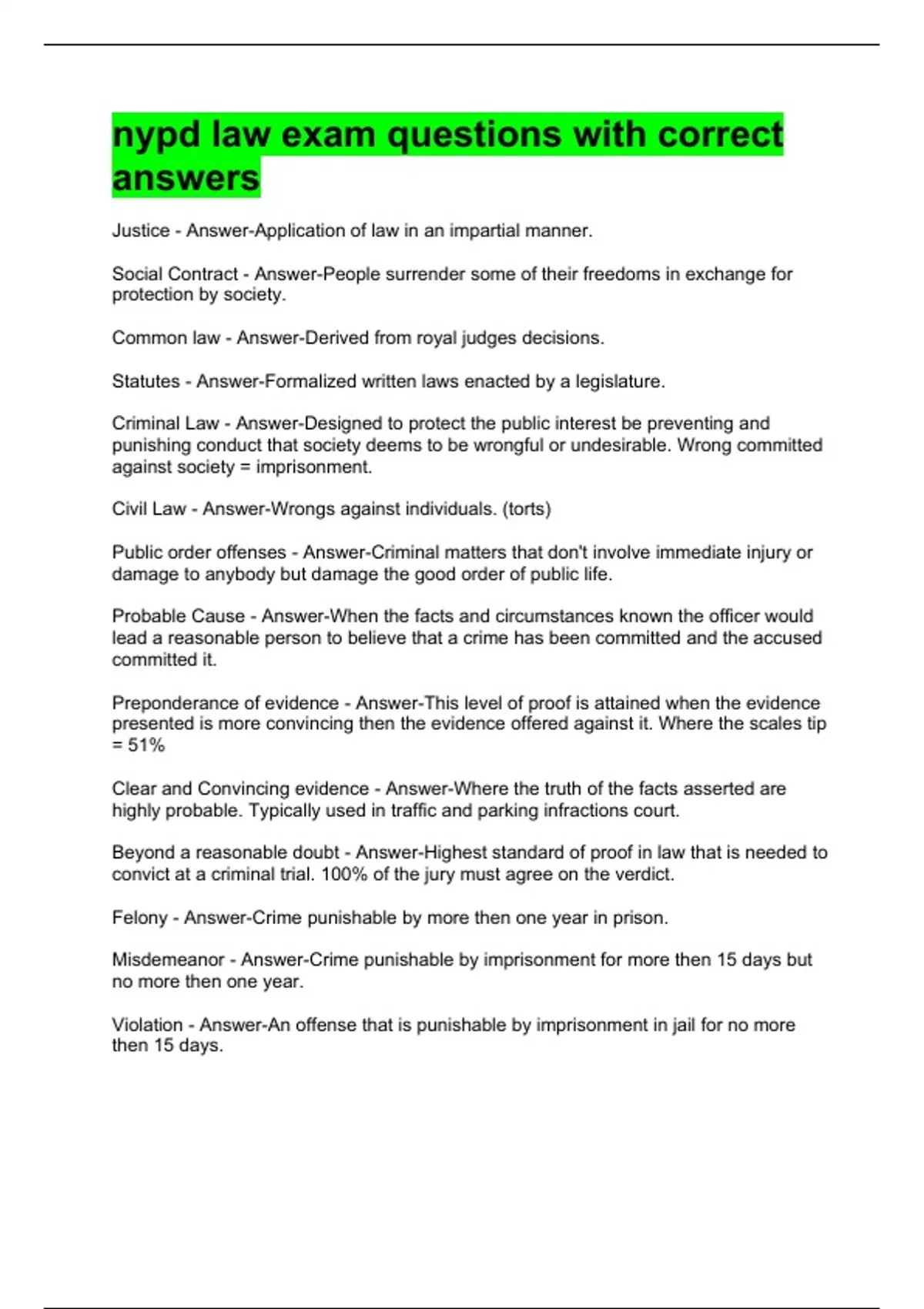 nypd law exam questions with correct answers Article 1 - Answer-Establishes the legislative branch of the government that consists of the senate and house of representatives. Elected by the people. Article 2 - Answer-Establishes the executive branch of the government. The president is given power to appoint the Attorney general as the head of the department of justice. Article 3 - Answer-Establishes the Supreme Court and authorizes congress to establish lower federal courts. Bill of rights - Answer-The first 10 amendments of the constitution that refer to individual rights. 1st amendment - Answer-Freedom of Religion, Speech, Press, Assembly, and Petition 2nd amendment - Answer-Right to keep and bear arms 4th amendment - Answer-Freedom from unreasonable searches and seizures 5th amendment - Answer-The Right to Remain Silent/Double Jeopardy, right to due process 6th amendment - Answer-Right to a fair, speedy trial 8th amendment - Answer-Protection from cruel and unusual punishment and excessive bail.