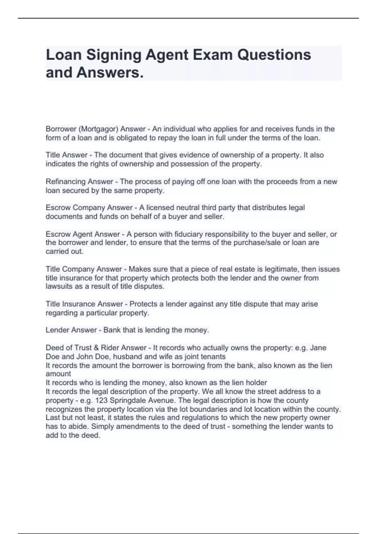 Loan Signing Agent Exam Questions and Answers
