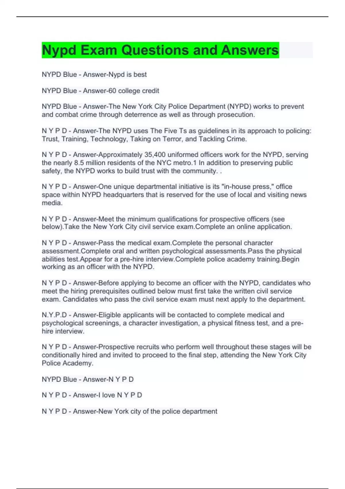 Nypd Exam Questions and Answers N Y P D - Answer-I am die-hard and loyalty N Y P D - Answer-Before applying to become an officer with the NYPD, candidates who meet the hiring prerequisites outlined below must first take the written civil service exam. Candidates who pass the civil service exam must next apply to the department. N Y P D - Answer-Before applying to become an officer with the NYPD, candidates who meet the hiring prerequisites outlined below must first take the written civil service exam. Candidates who pass the civil service exam must next apply to the department. N Y P D - Answer-The mission of the NYPD is to improve the quality of life in New York City. NYPD police officers work to maintain order and enforce local laws by preventing and investigating crimes and upholding the legal system. N Y P D - Answer-As the largest municipal police force in the US, the NYPD houses numerous specialty divisions, including bureaus dedicated to counterterrorism, housing, intelligence, transit and transportation, and detective and patrol services. N Y P D - Answer-1Officers may also specialize in aviation, emergency services, highway patrol, or crime scene investigation. With so many departments and chances for specialization, there are always opportunities to pursue career interests and seek promotion within the NYPD. N Y P D - Answer-To be eligible to sit for the written civil service exam, applicants must be between the ages of 17.5 and 35. N Y P D - Answer-To be hired as an officer with the NYPD, candidates must be US citizens and at least 21 years of age, hold a high school diploma plus at least 60 college credits with a minimum 2.0 GPA, N Y P D - Answer-have a valid New York driver's license, and reside within the five boroughs of New York City or surrounding counties. The college experience requirement may be waived with two years of full-time service with the US Armed Forces. N Y P D - Answer-1 N Y P D - Answer-Once hired as a police recruit, prospective officers attend the New York City Police Academy. The rigorous training program lasts six months. Courses cover such topics as law, behavioral science, physical training and tactics, police science, firearms training, and First Aid/ CPR.