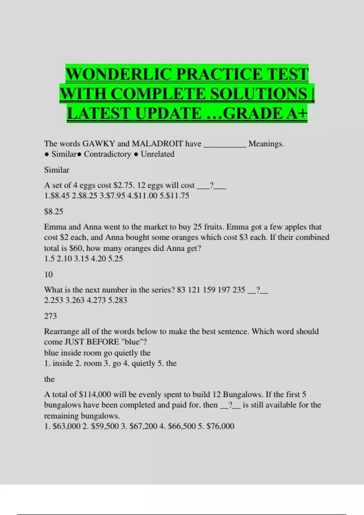 WONDERLIC PRACTICE TEST WITH COMPLETE SOLUTIONS | LATEST UPDATE …GRADE A+ The words GAWKY and MALADROIT have __________ Meanings. ● Similar● Contradictory ● Unrelated Similar A set of 4 eggs cost $2.75. 12 eggs will cost ___?___ 1.$8.45 2.$8.25 3.$7.95 4.$11.00 5.$11.75 $8.25 Emma and Anna went to the market to buy 25 fruits. Emma got a few apples that cost $2 each, and Anna bought some oranges which cost $3 each. If their combined total is $60, how many oranges did Anna get? 1.5 2.10 3.15 4.20 5.25 10 What is the next number in the series? __?__ 2.253 3.263 4.273 5.283 273 Rearrange all of the words below to make the best sentence. Which word should come JUST BEFORE "blue"? blue inside room go quietly the 1. inside 2. room 3. go 4. quietly 5. the the A total of $114,000 will be evenly spent to build 12 Bungalows. If the first 5 bungalows have been completed and paid for, then __?__ is still available for the remaining bungalows. 1. $63,000 2. $59,500 3. $67,200 4. $66,500 5. $76,000