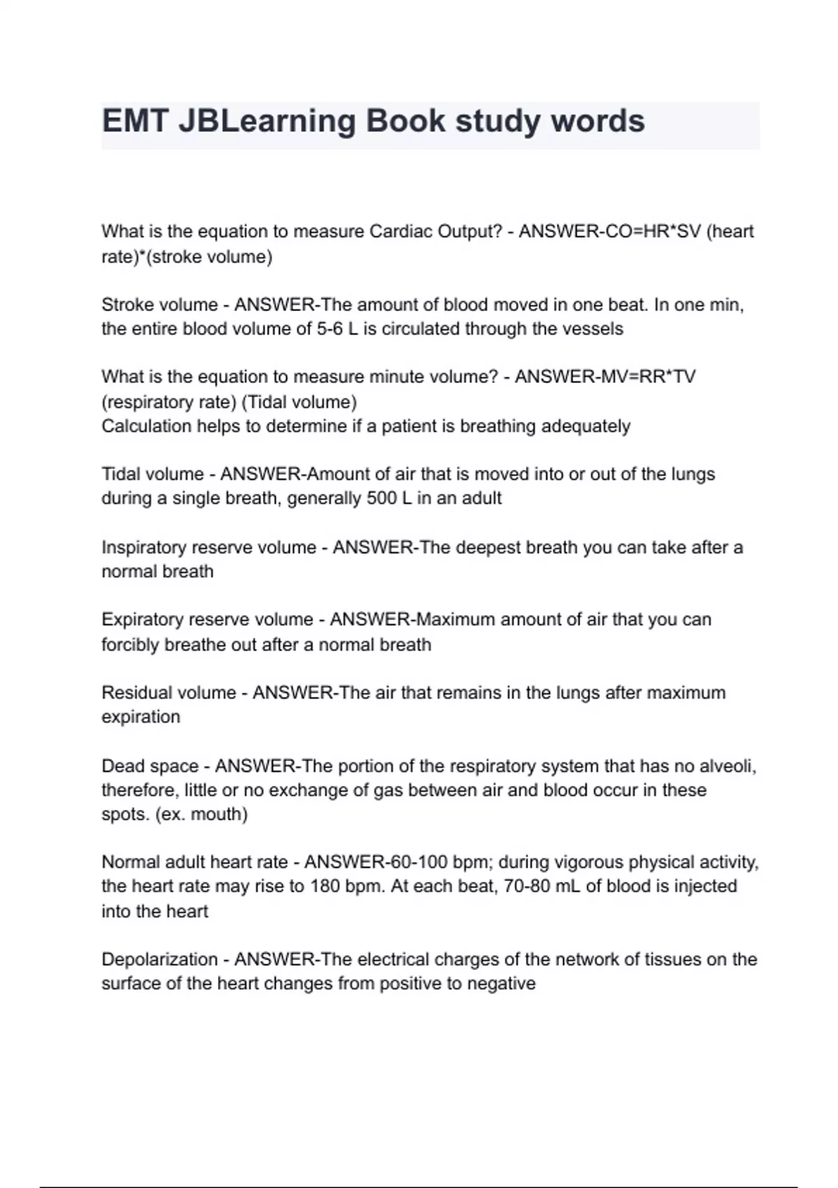 What is the equation to measure Cardiac Output? - ANSWER-CO=HR*SV (heart rate)*(stroke volume) Stroke volume - ANSWER-The amount of blood moved in one beat. In one min, the entire blood volume of 5-6 L is circulated through the vessels What is the equation to measure minute volume? - ANSWER-MV=RR*TV (respiratory rate) (Tidal volume) Calculation helps to determine if a patient is breathing adequately Tidal volume - ANSWER-Amount of air that is moved into or out of the lungs during a single breath, generally 500 L in an adult Inspiratory reserve volume - ANSWER-The deepest breath you can take after a normal breath Expiratory reserve volume - ANSWER-Maximum amount of air that you can forcibly breathe out after a normal breath Residual volume - ANSWER-The air that remains in the lungs after maximum expiration Dead space - ANSWER-The portion of the respiratory system that has no alveoli, therefore, little or no exchange of gas between air and blood occur in these spots. (ex. mouth) Normal adult heart rate - ANSWER-60-100 bpm; during vigorous physical activity, the heart rate may rise to 180 bpm. At each beat, 70-80 mL of blood is injected into the heart Depolarization - ANSWER-The electrical charges of the network of tissues on the surface of the heart changes from positive to negative Repolarization - ANSW