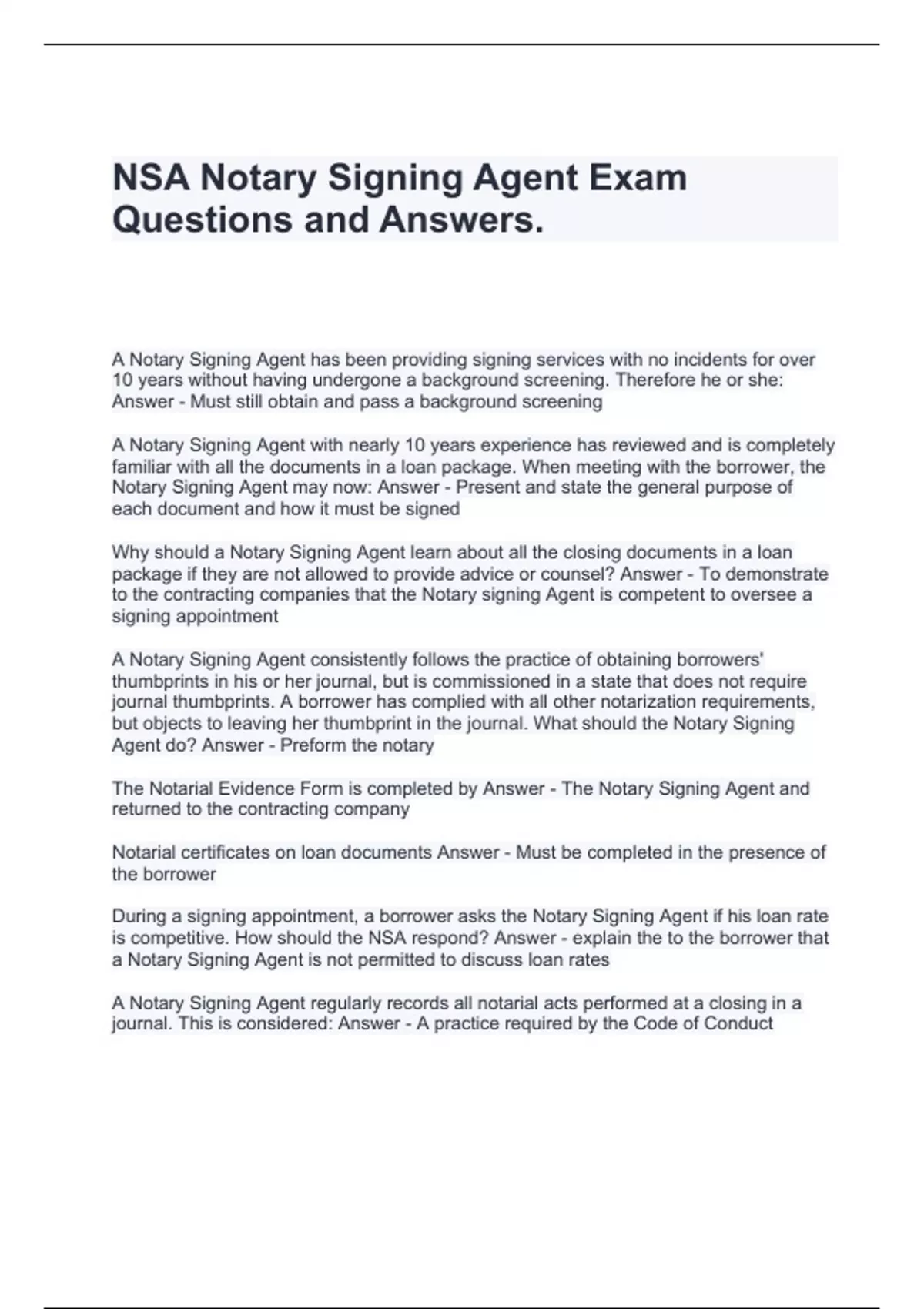 NSA Notary Signing Agent Exam Questions and Answers