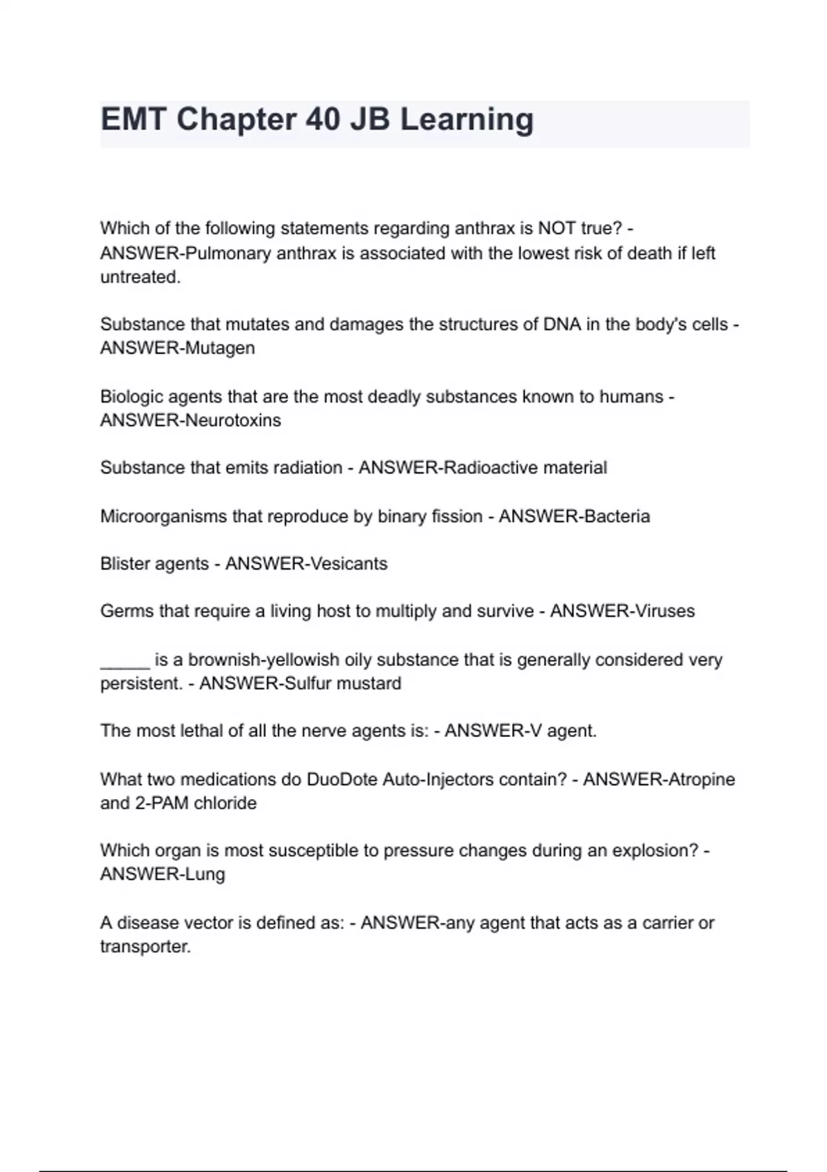 Which of the following statements regarding anthrax is NOT true? - ANSWER-Pulmonary anthrax is associated with the lowest risk of death if left untreated. Substance that mutates and damages the structures of DNA in the body's cells - ANSWER-Mutagen Biologic agents that are the most deadly substances known to humans - ANSWER-Neurotoxins Substance that emits radiation - ANSWER-Radioactive material Microorganisms that reproduce by binary fission - ANSWER-Bacteria Blister agents - ANSWER-Vesicants Germs that require a living host to multiply and survive - ANSWER-Viruses _____ is a brownish-yellowish oily substance that is generally considered very persistent. - ANSWER-Sulfur mustard The most lethal of all the nerve agents is: - ANSWER-V agent. What two medications do DuoDote Auto-Injectors contain? - ANSWER-Atropine and 2-PAM chloride Which organ is most susceptible to pressure changes during an explosion? - ANSWER-Lung A disease vector is defined as: - ANSWER-any agent that acts as a carrier or transporter.