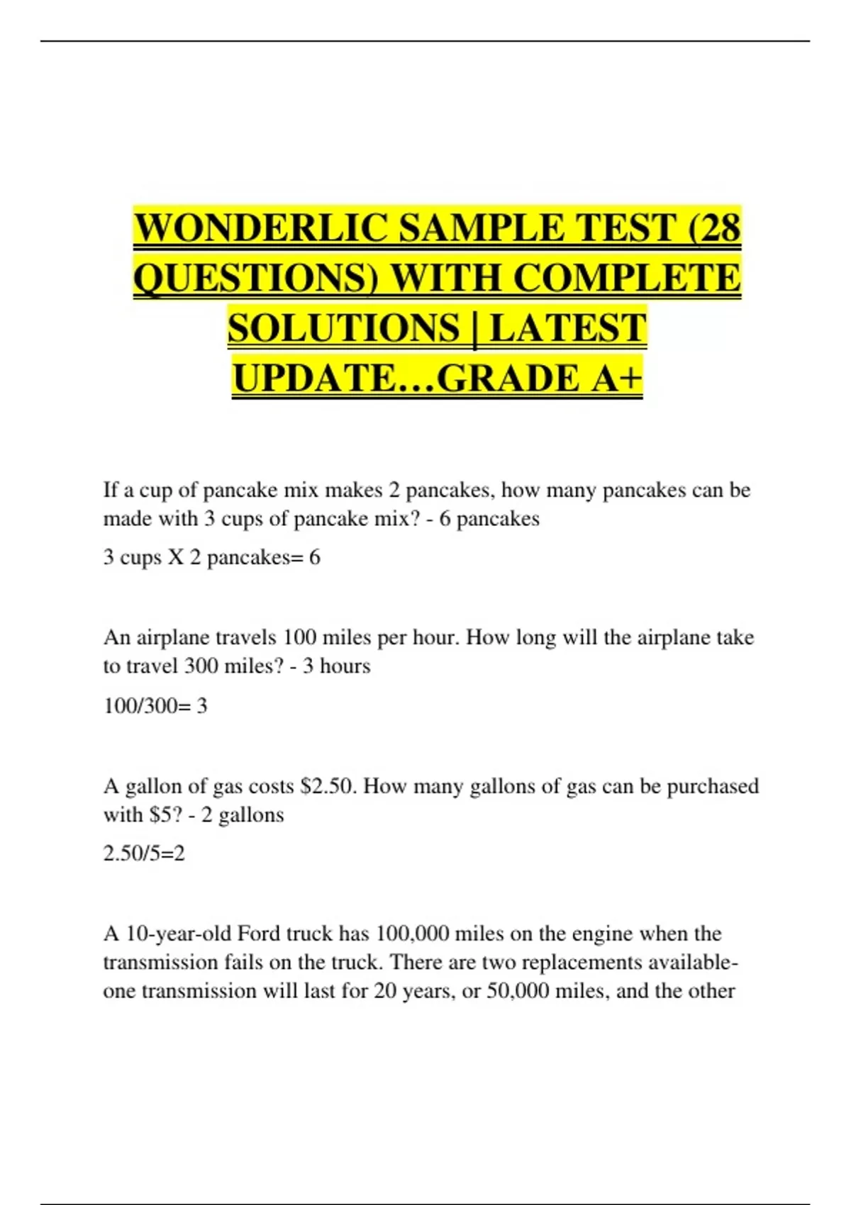 WONDERLIC SAMPLE TEST (28 QUESTIONS) WITH COMPLETE SOLUTIONS | LATEST UPDATE…GRADE A+ If a cup of pancake mix makes 2 pancakes, how many pancakes can be made with 3 cups of pancake mix? - 6 pancakes 3 cups X 2 pancakes= 6 An airplane travels 100 miles per hour. How long will the airplane take to travel 300 miles? - 3 hours 100/300= 3 A gallon of gas costs $2.50. How many gallons of gas can be purchased with $5? - 2 gallons 2.50/5=2 A 10-year-old Ford truck has 100,000 miles on the engine when the transmission fails on the truck. There are two replacements availableone transmission will last for 20 years, or 50,000 miles, and the other