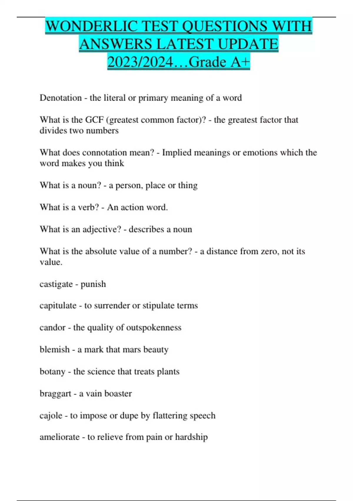 WONDERLIC TEST QUESTIONS WITH ANSWERS LATEST UPDATE 2023/2024…Grade A+ Denotation - the literal or primary meaning of a word What is the GCF (greatest common factor)? - the greatest factor that divides two numbers What does connotation mean? - Implied meanings or emotions which the word makes you think What is a noun? - a person, place or thing What is a verb? - An action word. What is an adjective? - describes a noun What is the absolute value of a number? - a distance from zero, not its value. castigate - punish capitulate - to surrender or stipulate terms candor - the quality of outspokenness blemish - a mark that mars beauty botany - the science that treats plants braggart - a vain boaster cajole - to impose or dupe by flattering speech ameliorate - to relieve from pain or hardship