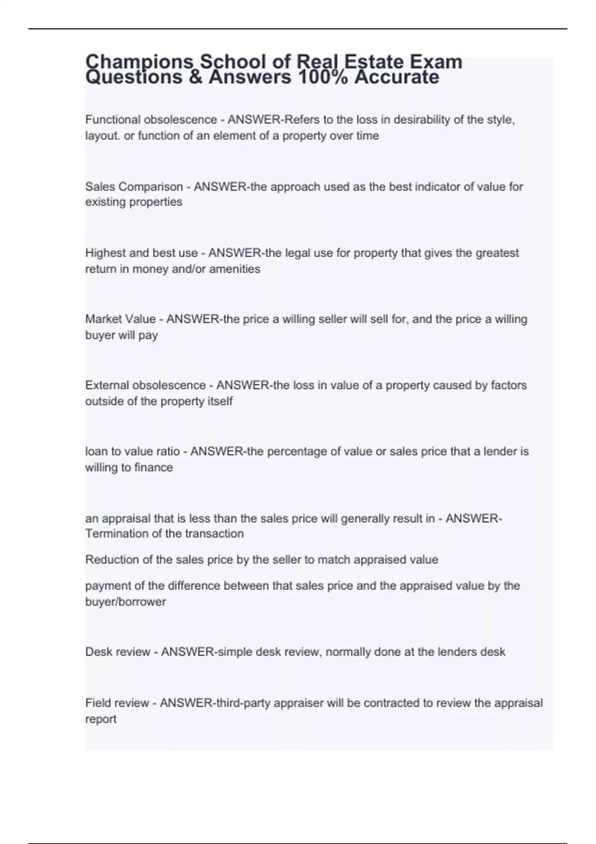 Functional obsolescence - ANSWER-Refers to the loss in desirability of the style, layout. or function of an element of a property over time Sales Comparison - ANSWER-the approach used as the best indicator of value for existing properties Highest and best use - ANSWER-the legal use for property that gives the greatest return in money and/or amenities Market Value - ANSWER-the price a willing seller will sell for, and the price a willing buyer will pay External obsolescence - ANSWER-the loss in value of a property caused by factors outside of the property itself loan to value ratio - ANSWER-the percentage of value or sales price that a lender is willing to finance an appraisal that is less than the sales price will generally result in - ANSWER-Termination of the transaction Reduction of the sales price by the seller to match appraised value payment of the difference between that sales price and the appraised value by the buyer/borrower Desk review - ANSWER-simple desk review, normally done at the lenders desk Field review - ANSWER-third-party appraiser will be contracted to review the appraisal report
