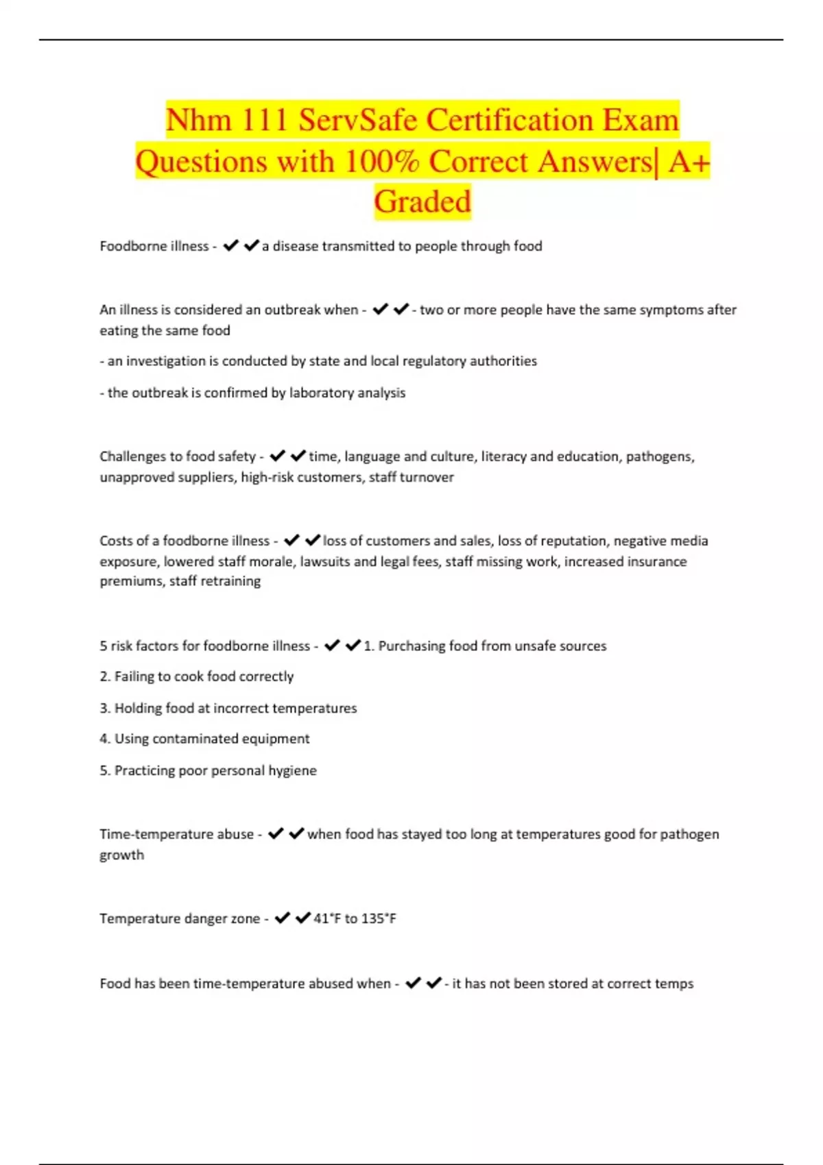 Nhm 111 ServSafe Certification Exam Questions with 100% Correct Answers| A+ Graded