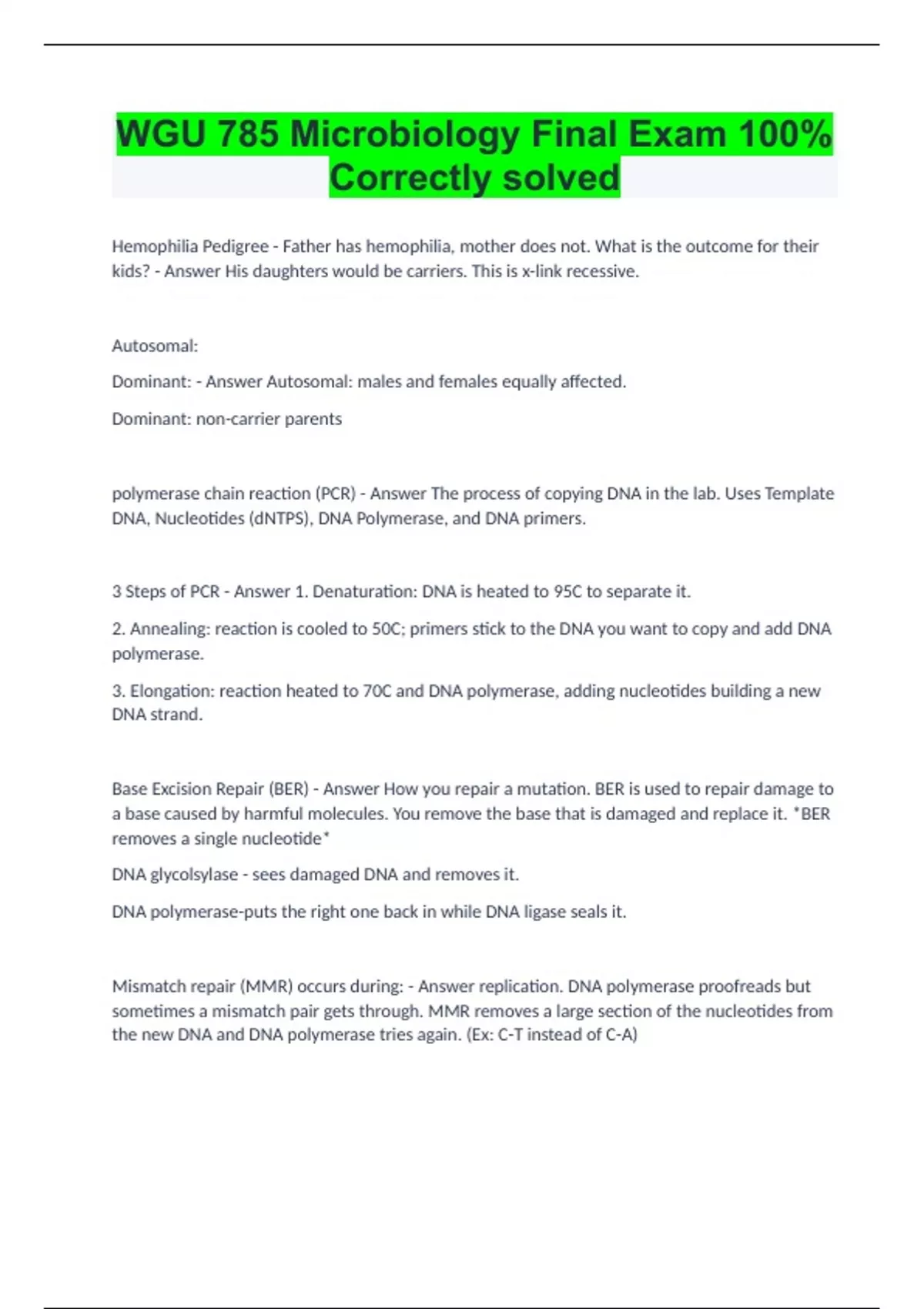 WGU 785 Microbiology Final Exam 100% Correctly solved Hemophilia Pedigree - Father has hemophilia, mother does not. What is the outcome for their kids? - Answer His daughters would be carriers. This is x-link recessive. Autosomal: Dominant: - Answer Autosomal: males and females equally affected. Dominant: non-carrier parents polymerase chain reaction (PCR) - Answer The process of copying DNA in the lab. Uses Template DNA, Nucleotides (dNTPS), DNA Polymerase, and DNA primers. 3 Steps of PCR - Answer 1. Denaturation: DNA is heated to 95C to separate it. 2. Annealing: reaction is cooled to 50C; primers stick to the DNA you want to copy and add DNA polymerase. 3. Elongation: reaction heated to 70C and DNA polymerase, adding nucleotides building a new DNA strand.