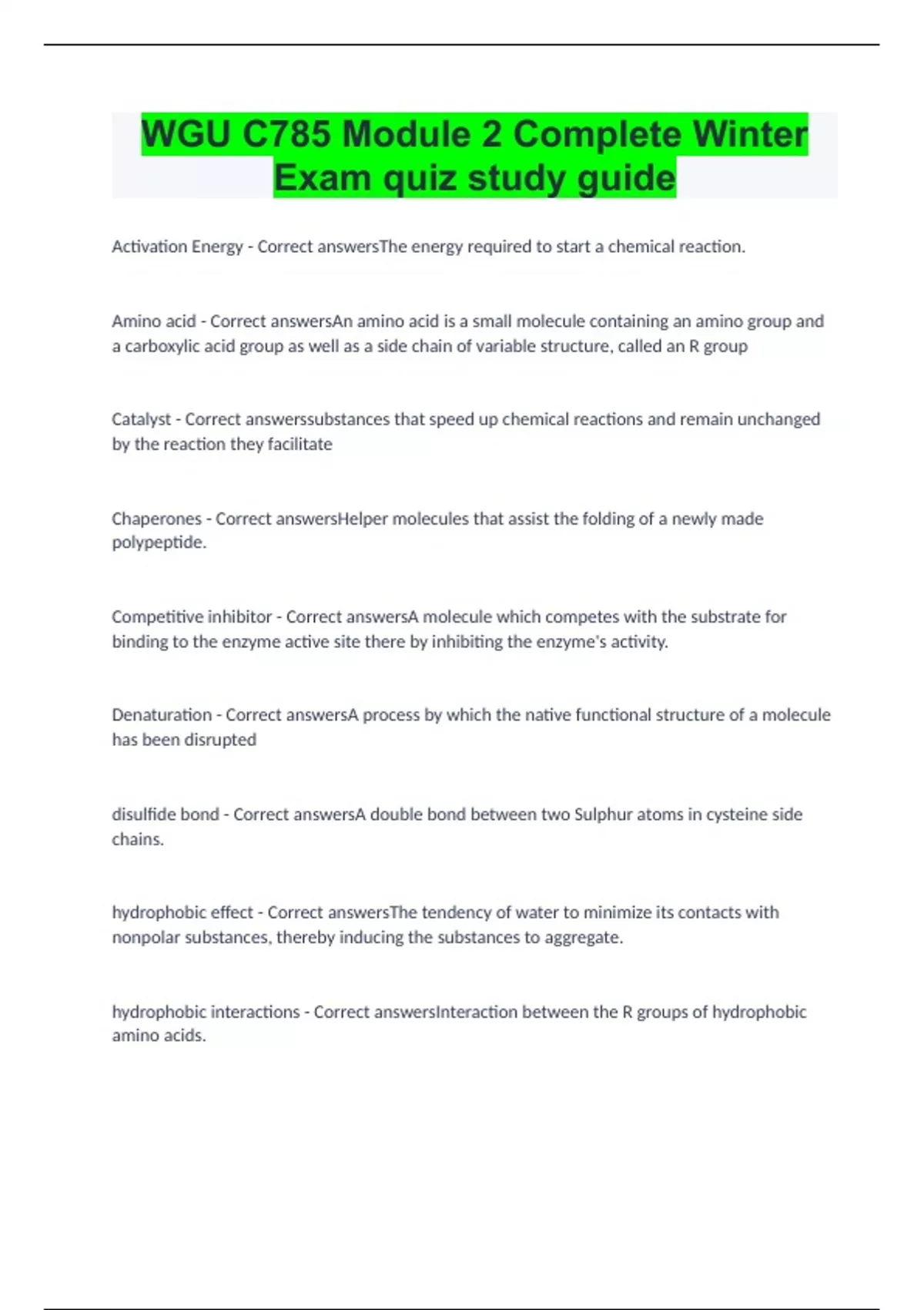WGU C785 Module 2 Complete Winter Exam quiz study guide Activation Energy - Correct answersThe energy required to start a chemical reaction. Amino acid - Correct answersAn amino acid is a small molecule containing an amino group and a carboxylic acid group as well as a side chain of variable structure, called an R group Catalyst - Correct answerssubstances that speed up chemical reactions and remain unchanged by the reaction they facilitate Chaperones - Correct answersHelper molecules that assist the folding of a newly made polypeptide. Competitive inhibitor - Correct answersA molecule which competes with the substrate for binding to the enzyme active site there by inhibiting the enzyme's activity. Denaturation - Correct answersA process by which the native functional structure of a molecule has been disrupted disulfide bond - Correct answersA double bond between two Sulphur atoms in cysteine side chains. hydrophobic effect - Correct answersThe tendency of water to minimize its contacts with nonpolar substances, thereby inducing the substances to aggregate.