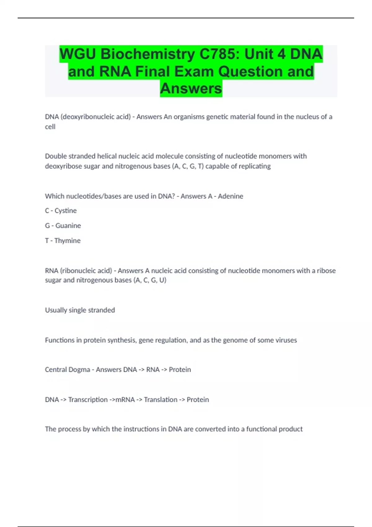 WGU Biochemistry C785: Unit 4 DNA and RNA Final Exam Question and Answers DNA (deoxyribonucleic acid) - Answers An organisms genetic material found in the nucleus of a cell Double stranded helical nucleic acid molecule consisting of nucleotide monomers with deoxyribose sugar and nitrogenous bases (A, C, G, T) capable of replicating Which nucleotides/bases are used in DNA? - Answers A - Adenine C - Cystine G - Guanine T - Thymine RNA (ribonucleic acid) - Answers A nucleic acid consisting of nucleotide monomers with a ribose sugar and nitrogenous bases (A, C, G, U) Usually single stranded