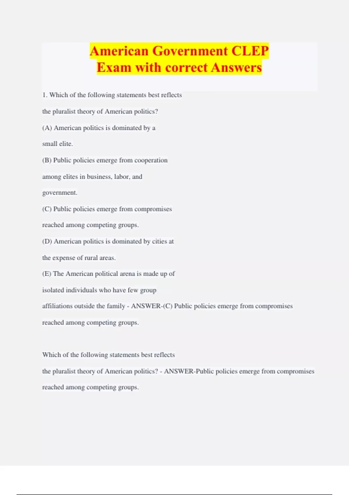1. Which of the following statements best reflects the pluralist theory of American politics? (A) American politics is dominated by a small elite. (B) Public policies emerge from cooperation among elites in business, labor, and government. (C) Public policies emerge from compromises reached among competing groups. (D) American politics is dominated by cities at the expense of rural areas. (E) The American political arena is made up of isolated individuals who have few group affiliations outside the family - ANSWER-(C) Public policies emerge from compromises reached among competing groups.