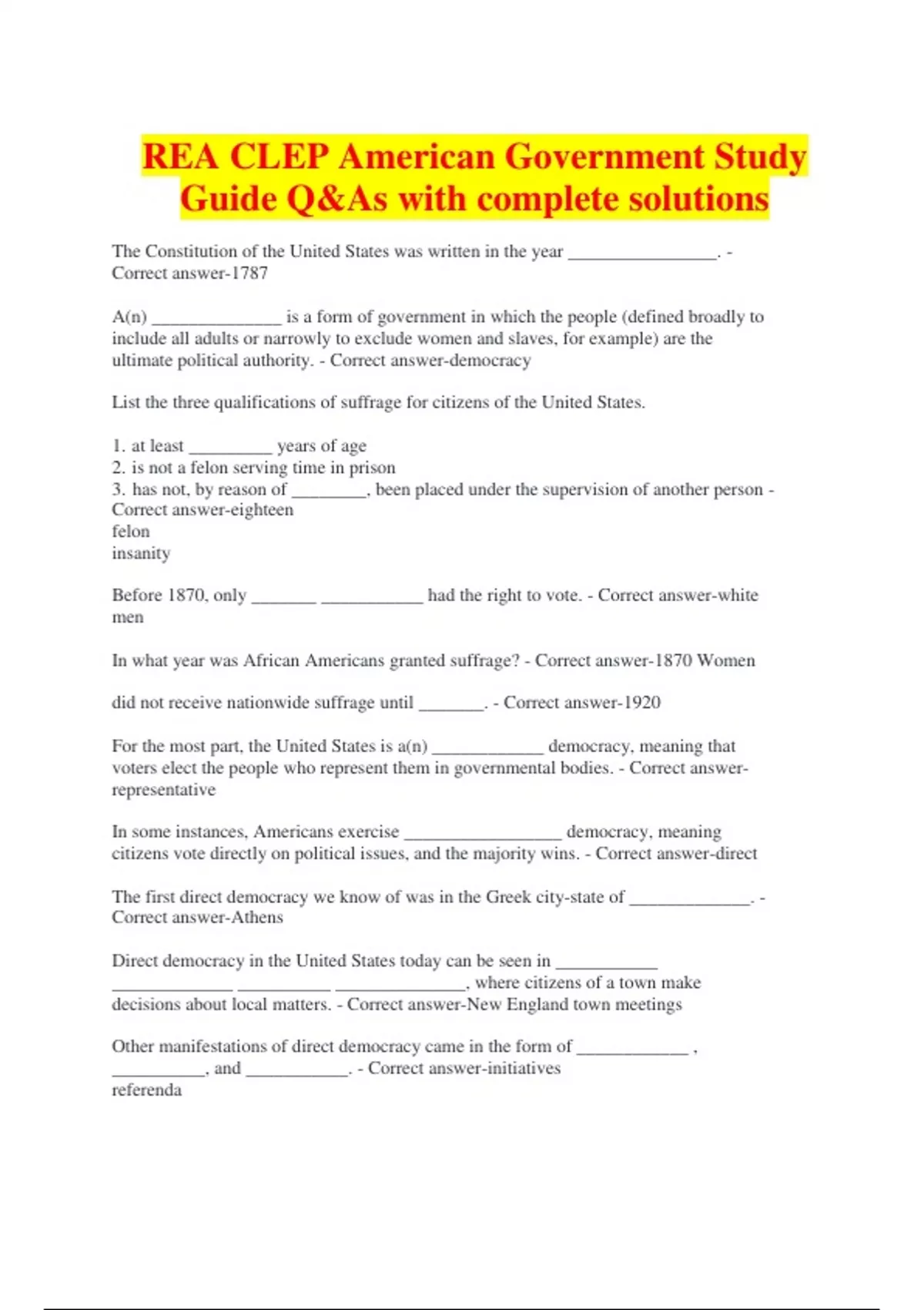 The Constitution of the United States was written in the year ________________. - Correct answer-1787 A(n) ______________ is a form of government in which the people (defined broadly to include all adults or narrowly to exclude women and slaves, for example) are the ultimate political authority. - Correct answer-democracy List the three qualifications of suffrage for citizens of the United States. 1. at least _________ years of age 2. is not a felon serving time in prison 3. has not, by reason of ________, been placed under the supervision of another person - Correct answer-eighteen felon insanity