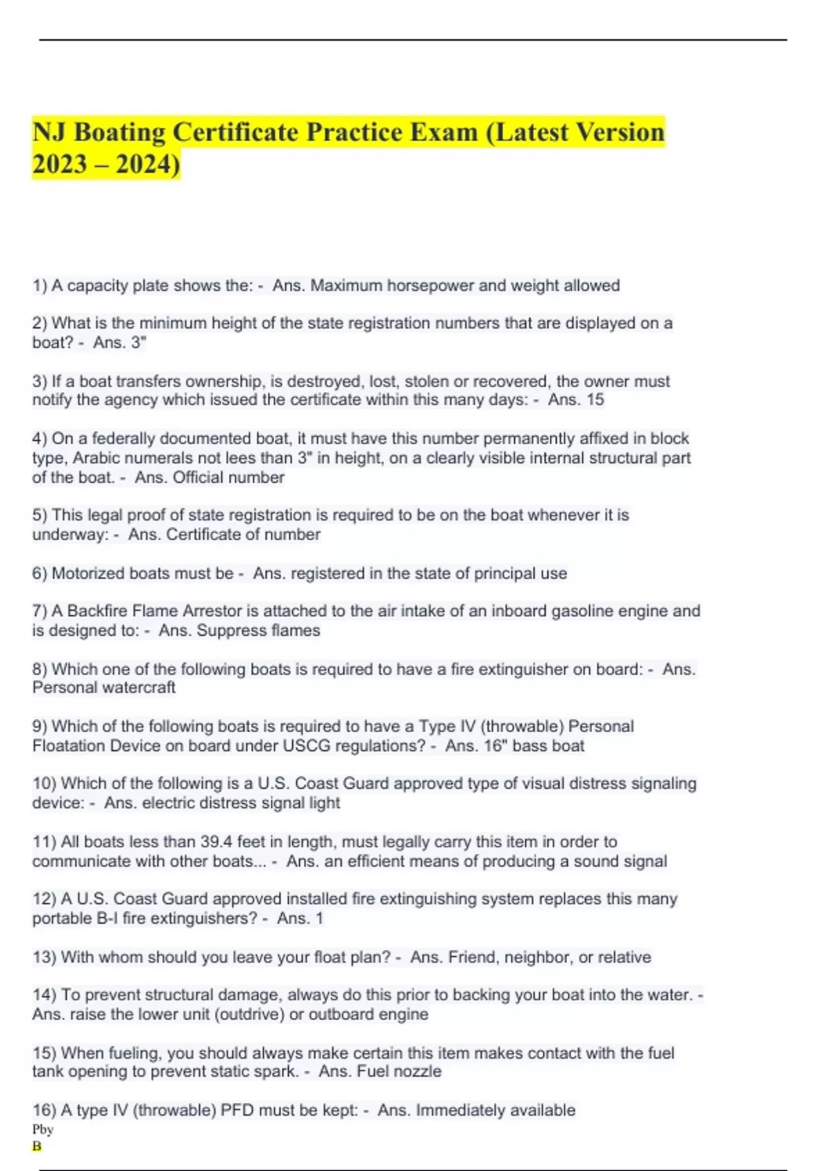 1) A capacity plate shows the: - Ans. Maximum horsepower and weight allowed 2) What is the minimum height of the state registration numbers that are displayed on a boat? - Ans. 3" 3) If a boat transfers ownership, is destroyed, lost, stolen or recovered, the owner must notify the agency which issued the certificate within this many days: - Ans. 15 4) On a federally documented boat, it must have this number permanently affixed in block type, Arabic numerals not lees than 3" in height, on a clearly visible internal structural part of the boat. - Ans. Official number 5) This legal proof of state registration is required to be on the boat whenever it is underway: - Ans. Certificate of number 6) Motorized boats must be - Ans. registered in the state of principal use 7) A Backfire Flame Arrestor is attached to the air intake of an inboard gasoline engine and is designed to: - Ans. Suppress flames 8) Which one of the following boats is required to have a fire extinguisher on board: - Ans. Personal watercraft 9) Which of the following boats is required to have a Type IV (throwable) Personal Floatation Device on board under USCG regulations? - Ans. 16" bass boat 10) Which of the following is a U.S. Coast Guard approved type of visual distress signaling device: - Ans. electric distress signal light 11) All boats less than 39.4 feet in length, must legally carry this item in order to communicate with other boats... - Ans. an efficient means of producing a sound signal 12) A U.S. Coast Guard approved installed fire extinguishing system replaces this many portable B-I fire extinguishers? - Ans. 1 13) With whom should you leave your float plan? - Ans. Friend, neighbor, or relative 14) To prevent structural damage, always do this prior to backing your boat into the water. - Ans. raise the lower unit (outdrive) or outboard engine 15) When fueling, you should always make certain this item makes contact with the fuel tank opening to prevent static spark. - Ans. Fuel nozzle 16) A type IV (throwable) PFD must be kept: - Ans. Immediately available