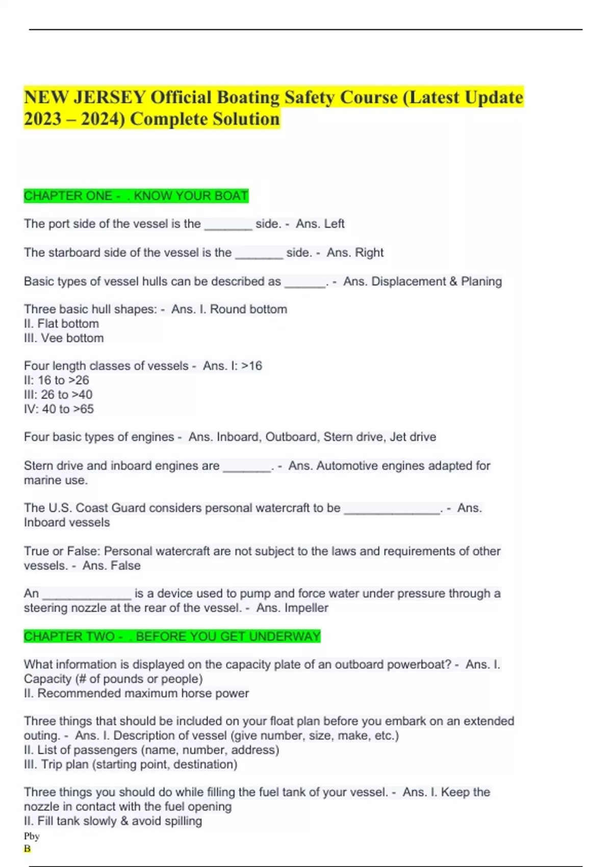 CHAPTER ONE - . KNOW YOUR BOAT The port side of the vessel is the _______ side. - Ans. Left The starboard side of the vessel is the _______ side. - Ans. Right Basic types of vessel hulls can be described as ______. - Ans. Displacement & Planing Three basic hull shapes: - Ans. I. Round bottom II. Flat bottom III. Vee bottom Four length classes of vessels - Ans. I: >16 II: 16 to >26 III: 26 to >40 IV: 40 to >65 Four basic types of engines - Ans. Inboard, Outboard, Stern drive, Jet drive Stern drive and inboard engines are _______. - Ans. Automotive engines adapted for marine use. The U.S. Coast Guard considers personal watercraft to be ______________. - Ans. Inboard vessels True or False: Personal watercraft are not subject to the laws and requirements of other vessels. - Ans. False An _____________ is a device used to pump and force water under pressure through a steering nozzle at the rear of the vessel. - Ans. Impeller CHAPTER TWO - . BEFORE YOU GET UNDERWAY What information is displayed on the capacity plate of an outboard powerboat? - Ans. I. Capacity (# of pounds or people) II. Recommended maximum horse power Three things that should be included on your float plan before you embark on an extended outing. - Ans. I. Description of vessel (give number, size, make, etc.) II. List of passengers (name, number, address) III. Trip plan (starting point, destination) Three things you should do while filling the fuel tank of your vessel. - Ans. I. Keep the nozzle in contact with the fuel opening II. Fill tank slowly & avoid spilling III. Never fill to the brim