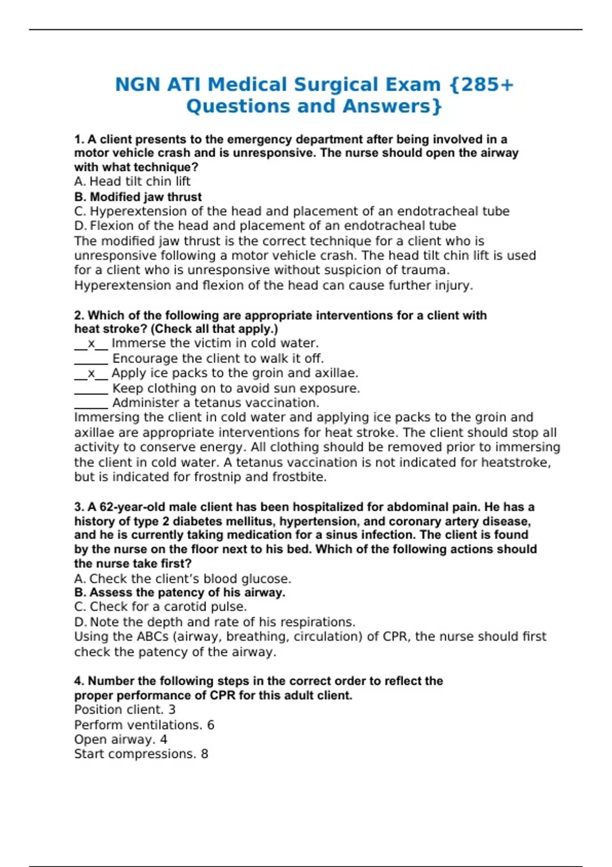 NGN ATI Medical Surgical Exam {285+ Questions and Answers} 1. A client presents to the emergency department after being involved in a motor vehicle crash and is unresponsive. The nurse should open the airway with what technique? A. Head tilt chin lift B. Modified jaw thrust C. Hyperextension of the head and placement of an endotracheal tube D. Flexion of the head and placement of an endotracheal tube