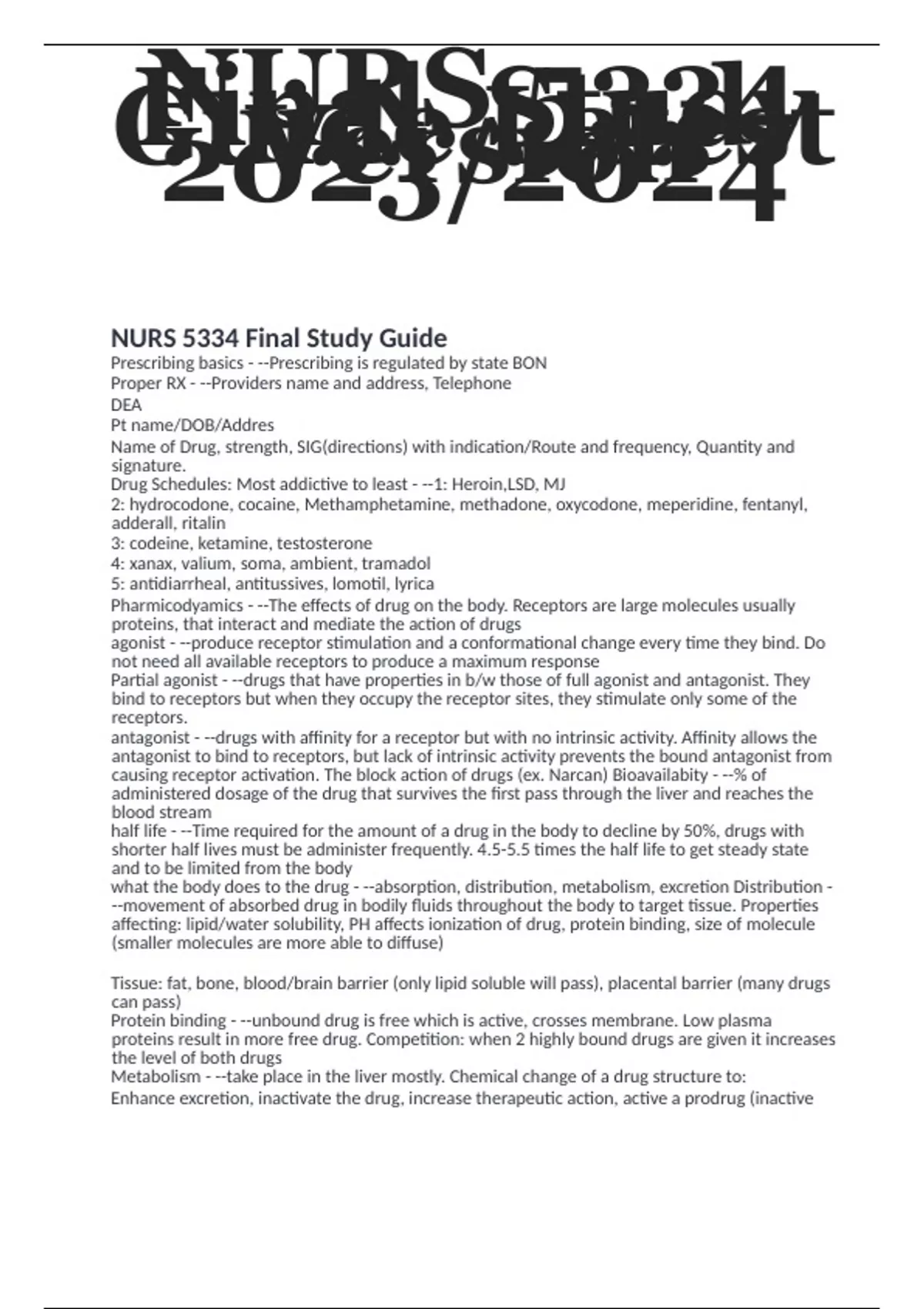 Guide Latest Version 2023/2024 NURS 5334 Final Study Guide Prescribing basics - --Prescribing is regulated by state BON Proper RX - --Providers name and address, Telephone DEA Pt name/DOB/Addres Name of Drug, strength, SIG(directions) with indication/Route and frequency, Quantity and signature. Drug Schedules: Most addictive to least - --1: Heroin,LSD, MJ 2: hydrocodone, cocaine, Methamphetamine, methadone, oxycodone, meperidine, fentanyl, adderall, ritalin 3: codeine, ketamine, testosterone 4: xanax, valium, soma, ambient, tramadol 5: antidiarrheal, antitussives, lomotil, lyrica Pharmicodyamics - --The effects of drug on the body. Receptors are large molecules usually proteins, that interact and mediate the action of drugs agonist - --produce receptor stimulation and a conformational change every time they bind. Do not need all available receptors to produce a maximum response Partial agonist - --drugs that have properties in b/w those of full agonist and antagonist. They bind to receptors but when they occupy the receptor sites, they stimulate only some of the receptors. antagonist - --drugs with affinity for a receptor but with no intrinsic activity. Affinity allows the antagonist to bind to receptors, but lack of intrinsic activity prevents the bound antagonist from causing receptor activation. The block action of drugs (ex. Narcan) Bioavailabity - --% of administered dosage of the drug that survives the first pass through the liver and reaches the blood stream half life - --Time required for the amount of a drug in the body to decline by 50%, drugs with shorter half lives must be administer frequently. 4.5-5.5 times the half life to get steady state and to be limited from the body what the body does to the drug - --absorption, distribution, metabolism, excretion Distribution