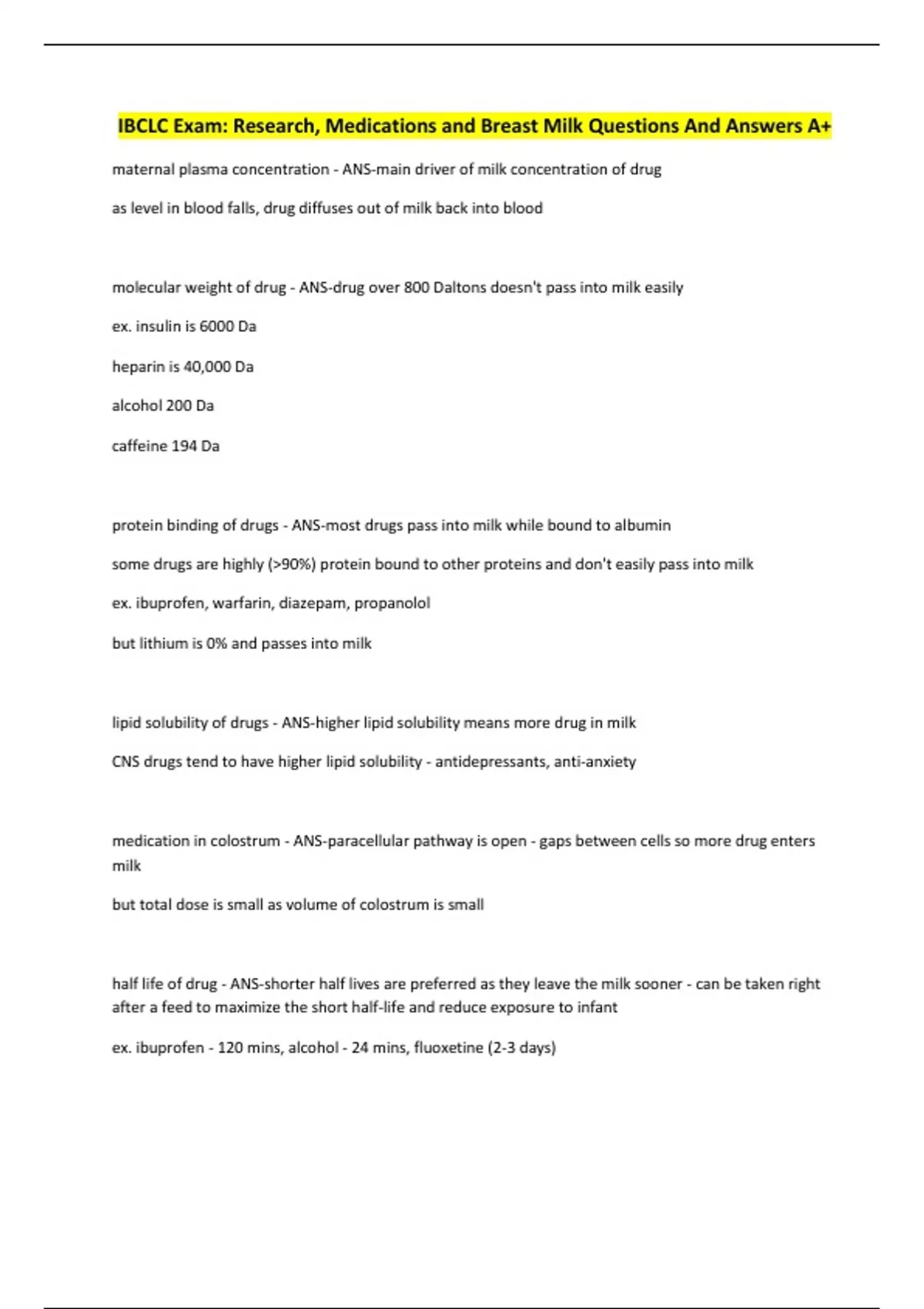 IBCLC Exam: Research, Medications and Breast Milk Questions And Answers A+ maternal plasma concentration - ANS-main driver of milk concentration of drug as level in blood falls, drug diffuses out of milk back into blood molecular weight of drug - ANS-drug over 800 Daltons doesn't pass into milk easily ex. insulin is 6000 Da heparin is 40,000 Da alcohol 200 Da caffeine 194 Da protein binding of drugs - ANS-most drugs pass into milk while bound to albumin some drugs are highly (>90%) protein bound to other proteins and don't easily pass into milk ex. ibuprofen, warfarin, diazepam, propanolol but lithium is 0% and passes into milk lipid solubility of drugs - ANS-higher lipid solubility means more drug in milk CNS drugs tend to have higher lipid solubility - antidepressants, anti-anxiety medication in colostrum - CONTINUES...