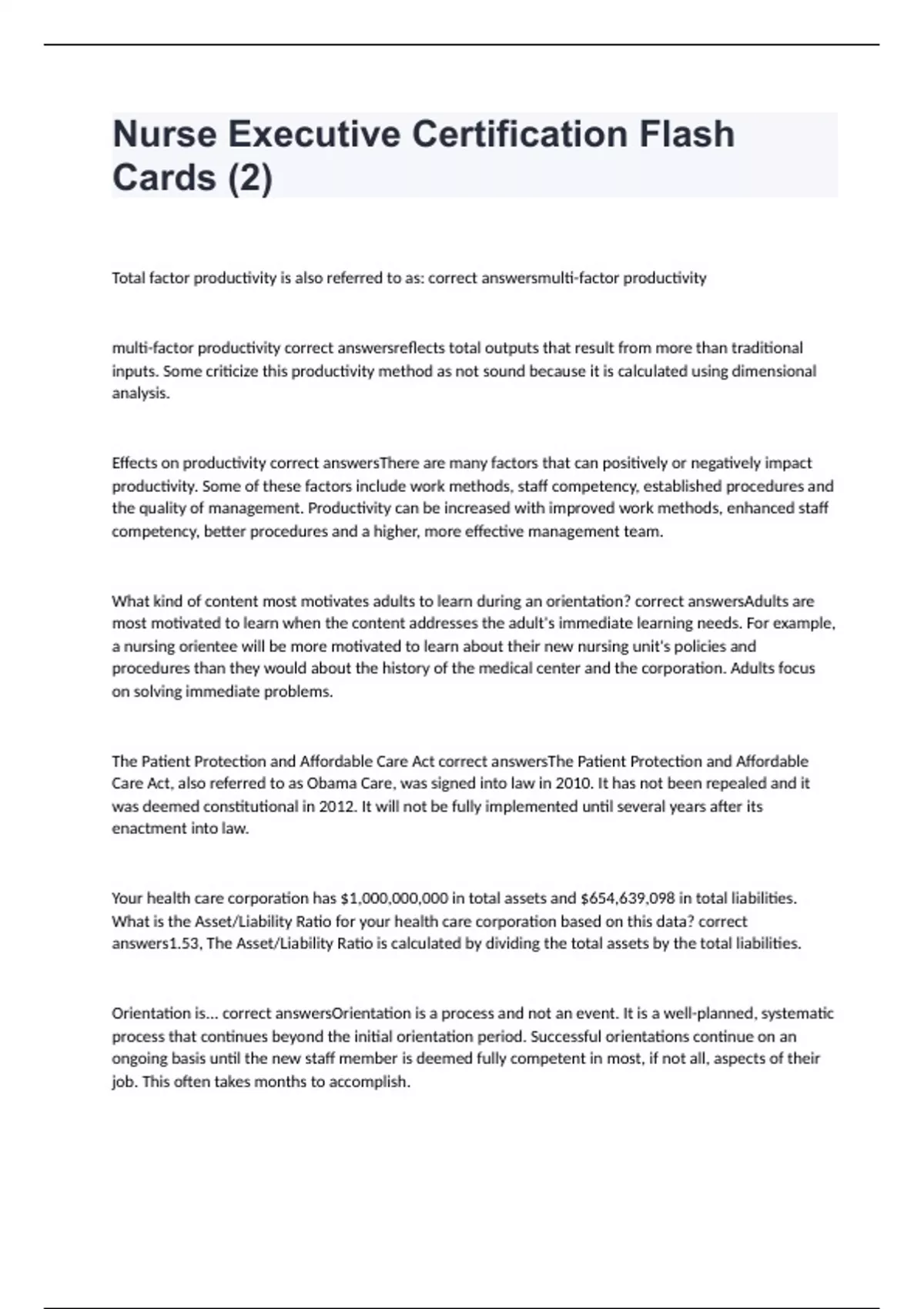 Nurse Executive Certification Flash Cards (2) with 100% complete solutions