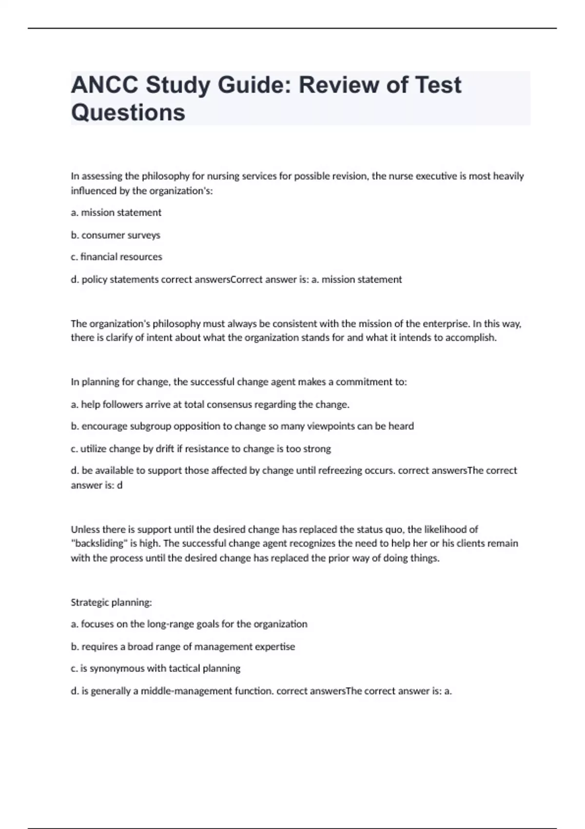 In assessing the philosophy for nursing services for possible revision, the nurse executive is most heavily influenced by the organization's: a. mission statement b. consumer surveys c. financial resources d. policy statements Correct answer is: a. mission statement The organization's philosophy must always be consistent with the mission of the enterprise. In this way, there is clarify of intent about what the organization stands for and what it intends to accomplish. In planning for change, the successful change agent makes a commitment to: a. help followers arrive at total consensus regarding the change. b. encourage subgroup opposition to change so many viewpoints can be heard c. utilize change by drift if resistance to change is too strong d. be available to support those affected by change until refreezing occurs. The correct answer is: d Unless there is support until the desired change has replaced the status quo, the likelihood of "backsliding" is high. The successful change agent recognizes the need to help her or his clients remain with the process until the desired change has replaced the prior way of doing things.
