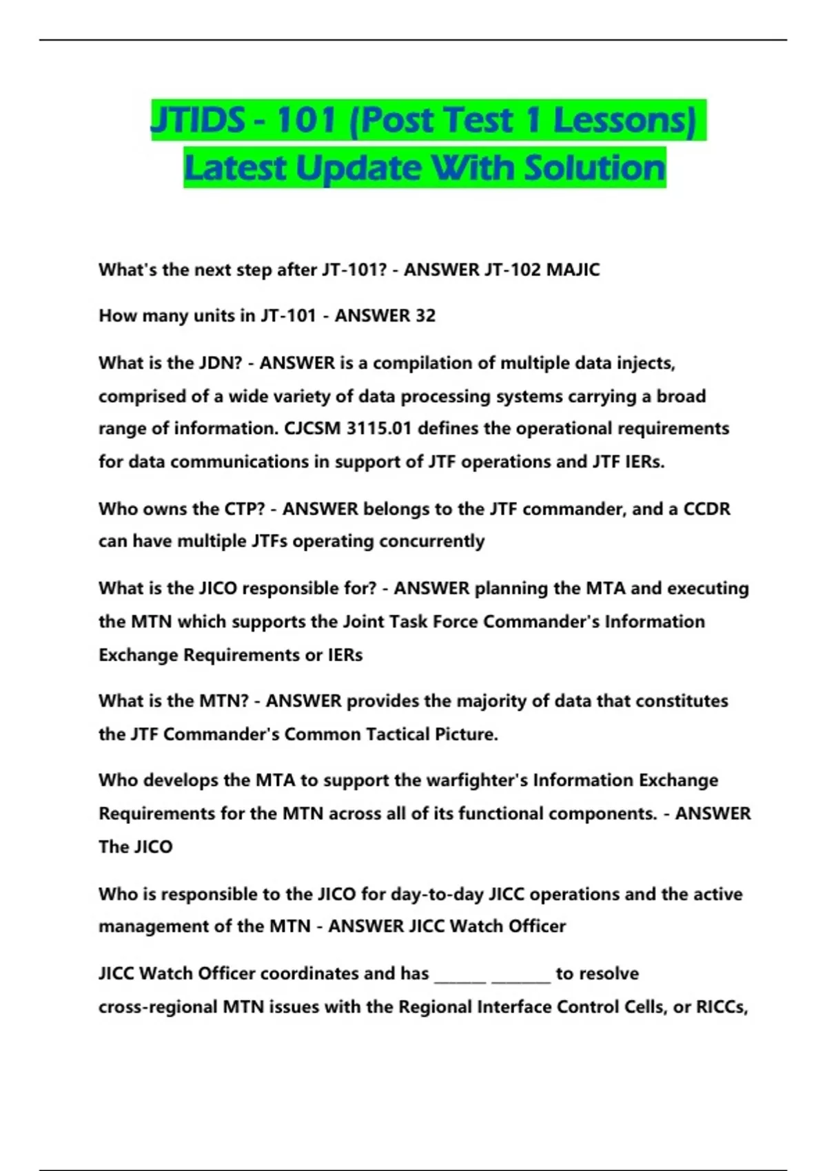 JTIDS - 101 (Post Te st 1 L esso ns) Latest Up date With Solut ion What's the next step after JT-101? - ANSWER JT-102 MAJIC How many units in JT-101 - ANSWER 32 What is the JDN? - ANSWER is a compilation of multiple data injects, comprised of a wide variety of data processing systems carrying a broad range of information. CJCSM 3115.01 defines the operational requirements for data communications in support of JTF operations and JTF IERs. Who owns the CTP? - ANSWER belongs to the JTF commander, and a CCDR can have multiple JTFs operating concurrently What is the JICO responsible for? - ANSWER planning the MTA and executing the MTN which supports the Joint Task Force Commander's Information Exchange Requirements or IERs What is the MTN? - ANSWER provides the majority of data that constitutes the JTF Commander's Common Tactical Picture. Who develops the MTA to support the warfighter's Information Exchange Requirements for the MTN across all of its functional components. - ANSWER The JICO Who is responsible to the JICO for day- to-day JICC operations and the active management of the MTN - ANSWER JICC Watch Officer JICC Watch Officer coordinates and has _______ ________ to resolve cross-regional MTN issues with the Regional Interface Control Cells, or RICCs, or Sector Interface Control Cells, or SICCs. - ANSWER resolution authority Explain the JTDC. - ANSWER The JTDC is responsible to the JICO and JICC Watch Officer for the accuracy, currency, and quality of track data, and ensures the effective flow of data and overall clarity of the tactical picture. They supervise the resolution of interface anomalies such as dual designations, duplicate tracks, identification conflicts, and category confl icts, and when assigned, transmits change data orders to resolve environment and identity conflicts Explain the responsibilities of the Link 16 Manager - ANSWER will coordinate the Link 16 initialization process, manage network role assignments and connectivity between JUs to include activation and deactivation of relays. The Link 16 Manager directs corrective actions when disruptions occur to ensure the effective and efficient exchange of information, ensure compliance with required interference protection features, or IPF, evaluates Link 16 performance and reports operational effectiveness, and resolves cross-regional Link 16 operations. IER - ANSWER Information Exchange Request What's the difference between the MTA (Multi-Tadil Architecture) and the MTN (Multi-Tadil Network)? - ANSWER An easy way to understand the difference between the two is that the MTA refers to the physical systems that make up the MTN, and the MTN refers to both the physical systems as well as the data flowing through those systems. In short, the MTA becomes