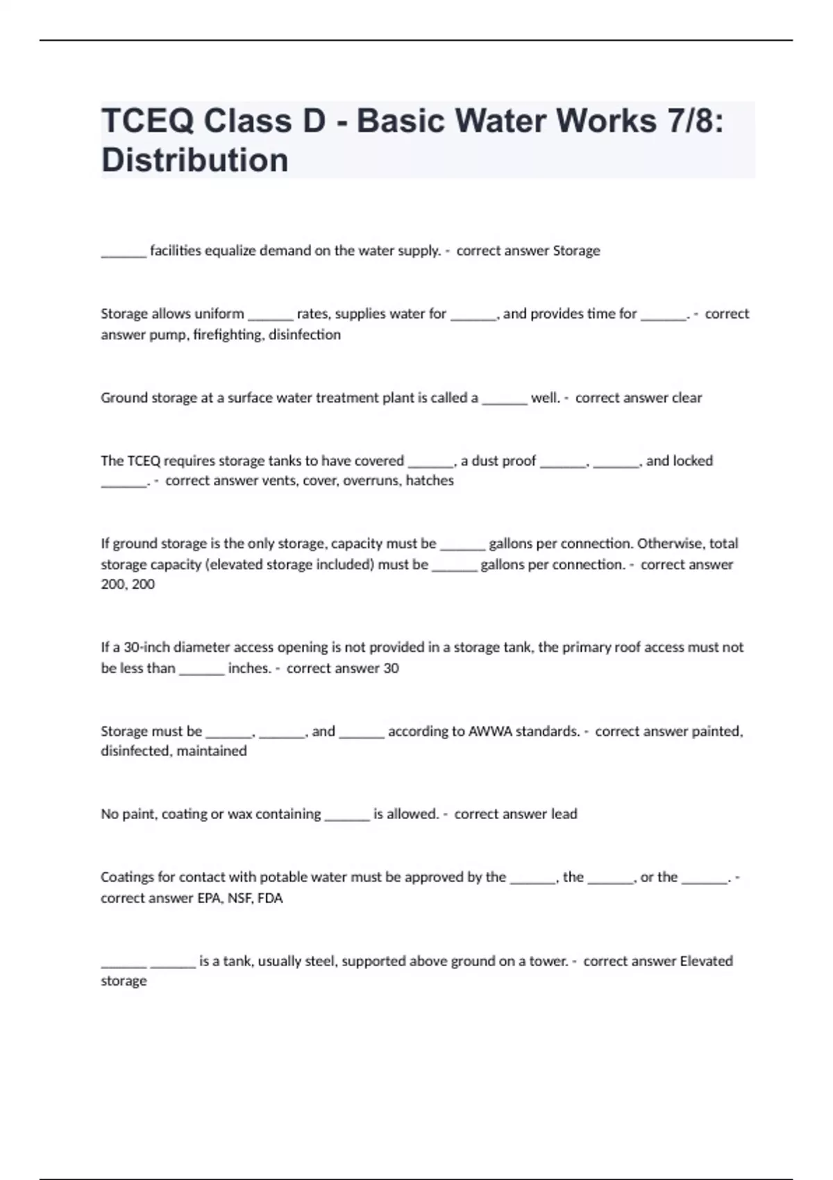 TCEQ Class D - Basic Water Works 7/8: Distribution______ facilities equalize demand on the water supply. - correct answer Storage Storage allows uniform ______ rates, supplies water for ______, and provides time for ______. - correct answer pump, firefighting, disinfection Ground storage at a surface water treatment plant is called a ______ well. - correct answer clear The TCEQ requires storage tanks to have covered ______, a dust proof ______, ______, and locked ______. - correct answer vents, cover, overruns, hatches If ground storage is the only storage, capacity must be ______ gallons per connection. Otherwise, total storage capacity (elevated storage included) must be ______ gallons per connection. - correct answer 200, 200 If a 30-inch diameter access opening is not provided in a storage tank, the primary roof access must not be less than ______ inches. - correct answer 30 Storage must be ______, ______, and ______ according to AWWA standards. - correct answer painted, disinfected, maintained No paint, coating or wax containing ______ is allowed. - correct answer lead Coatings for contact with potable water must be approved by the ______, the ______, or the ______. - correct answer EPA, NSF, FDA ______ ______ is a tank, usually steel, supported above ground on a tower. - correct answer Elevated storage