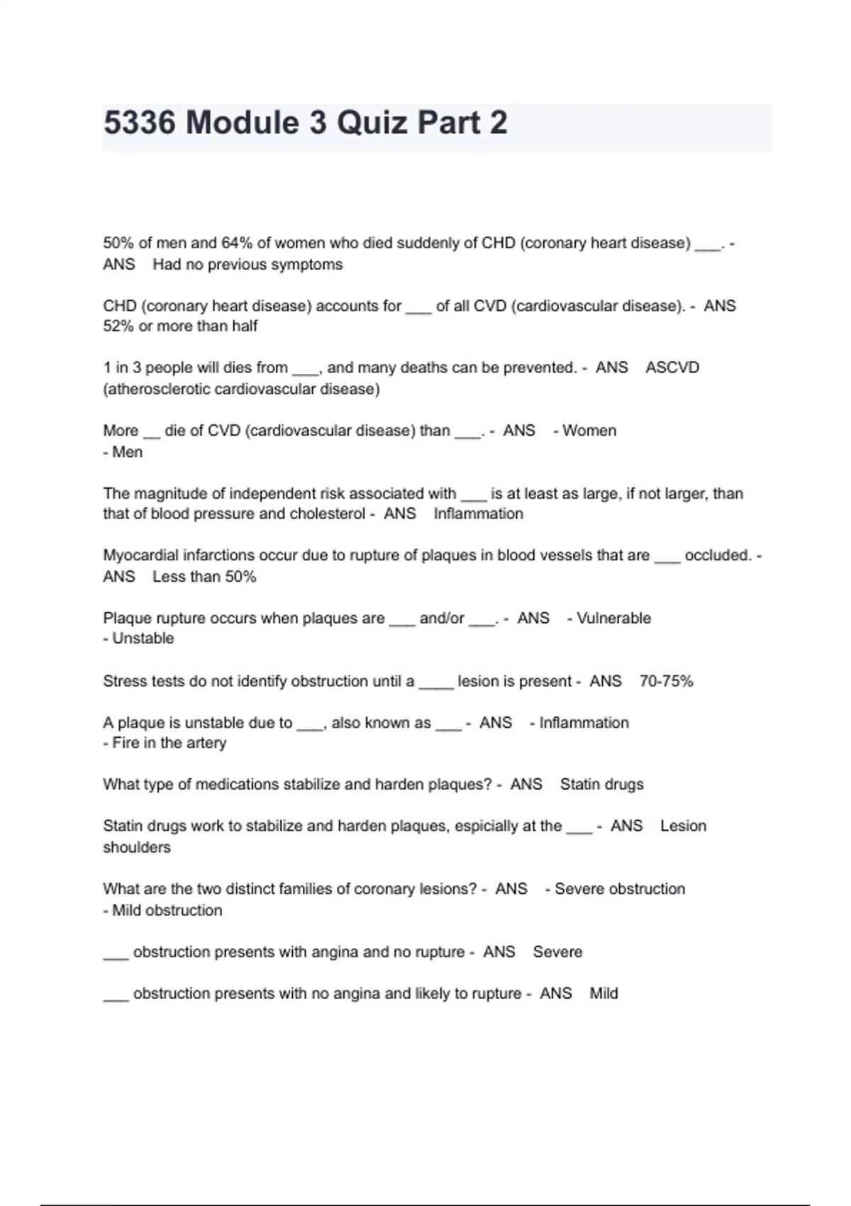 5336 Module 3 Quiz Part 2 Exam Questions And Answers 50% of men and 64% of women who died suddenly of CHD (coronary heart disease) ___. - ANS Had no previous symptoms CHD (coronary heart disease) accounts for ___ of all CVD (cardiovascular disease). - ANS 52% or more than half 1 in 3 people will dies from ___, and many deaths can be prevented. - ANS ASCVD (atherosclerotic cardiovascular disease) More __ die of CVD (cardiovascular disease) than ___. - ANS - Women - Men The magnitude of independent risk associated with ___ is at least as large, if not larger, than that of blood pressure and cholesterol - ANS Inflammation Myocardial infarctions occur due to rupture of plaques in blood vessels that are ___ occluded. - ANS Less than 50% Plaque rupture occurs when plaques are ___ and/or ___. - ANS - Vulnerable - Unstable Stress tests do not identify obstruction until a ____ lesion is present - ANS 70-75% A plaque is unstable due to ___, also known as ___ - ANS - Inflammation - Fire in the artery What type of medications stabilize and harden plaques? - ANS Statin drugs