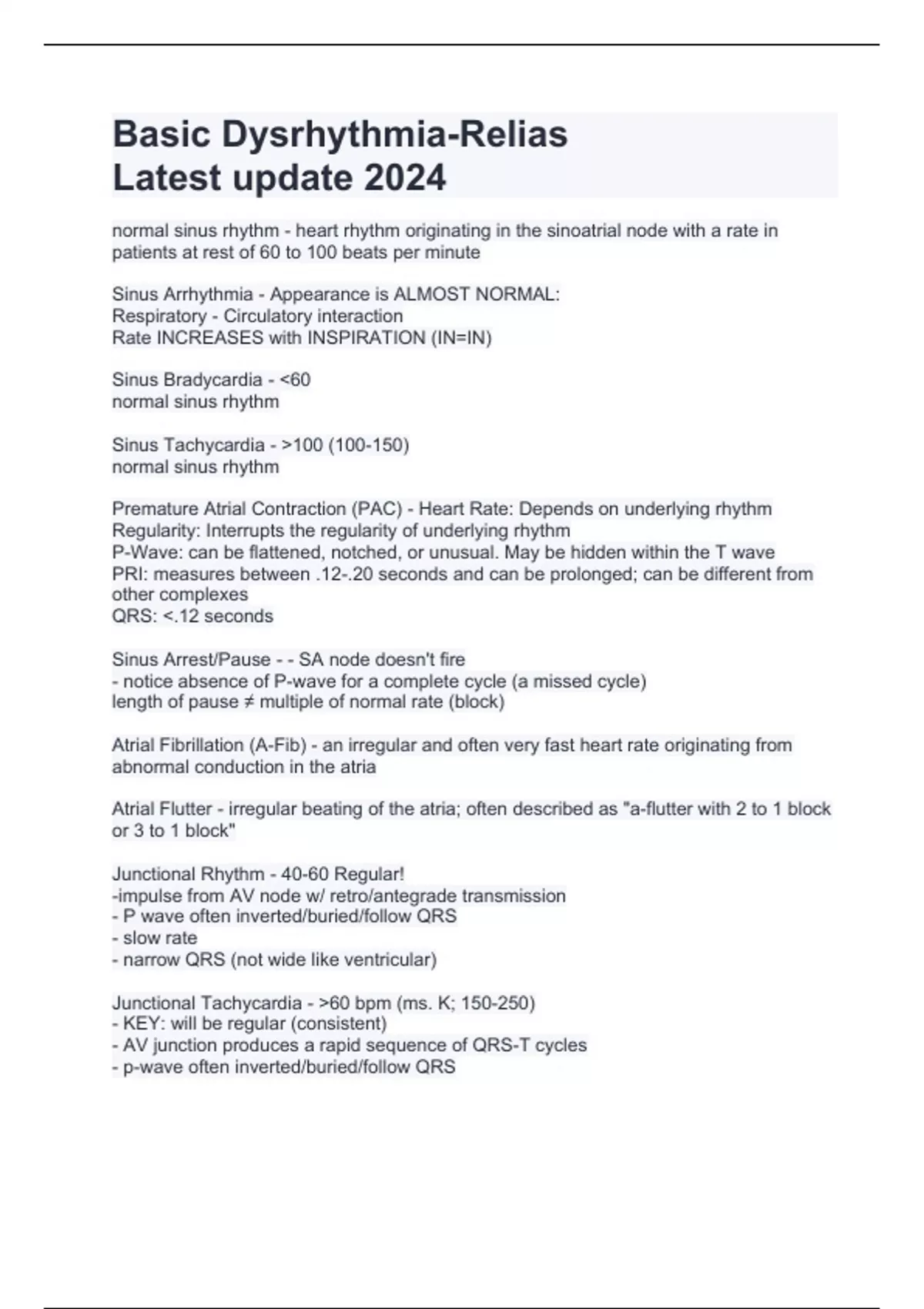 normal sinus rhythm - heart rhythm originating in the sinoatrial node with a rate in patients at rest of 60 to 100 beats per minute Sinus Arrhythmia - Appearance is ALMOST NORMAL: Respiratory - Circulatory interaction Rate INCREASES with INSPIRATION (IN=IN) Sinus Bradycardia - 60 normal sinus rhythm Sinus Tachycardia - 100 (100-150) normal sinus rhythm Premature Atrial Contraction (PAC) - Heart Rate: Depends on underlying rhythm Regularity: Interrupts the regularity of underlying rhythm P-Wave: can be flattened, notched, or unusual. May be hidden within the T wave PRI: measures between .12-.20 seconds and can be prolonged; can be different from other complexes QRS: .12 seconds Sinus Arrest/Pause - - SA node doesn't fire - notice absence of P-wave for a complete cycle (a missed cycle) length of pause ≠ multiple of normal rate (block) Atrial Fibrillation (A-Fib) - an irregular and often very fast heart rate originating from abnormal conduction in the atria Atrial Flutter - irregular beating of the atria; often described as "a-flutter with 2 to 1 block or 3 to 1 block" Junctional Rhythm - 40-60 Regular! -impulse from AV node w/ retro/antegrade transmission - P wave often inverted/buried/follow QRS - slow rate - narrow QRS (not wide like ventricular) Junctional Tachycardia - 60 bpm (ms. K; 150-250) - KEY: will be regular (consistent) - AV junction produces a rapid sequence of QRS-T cycles - p-wave often inverted/buried/follow QRS