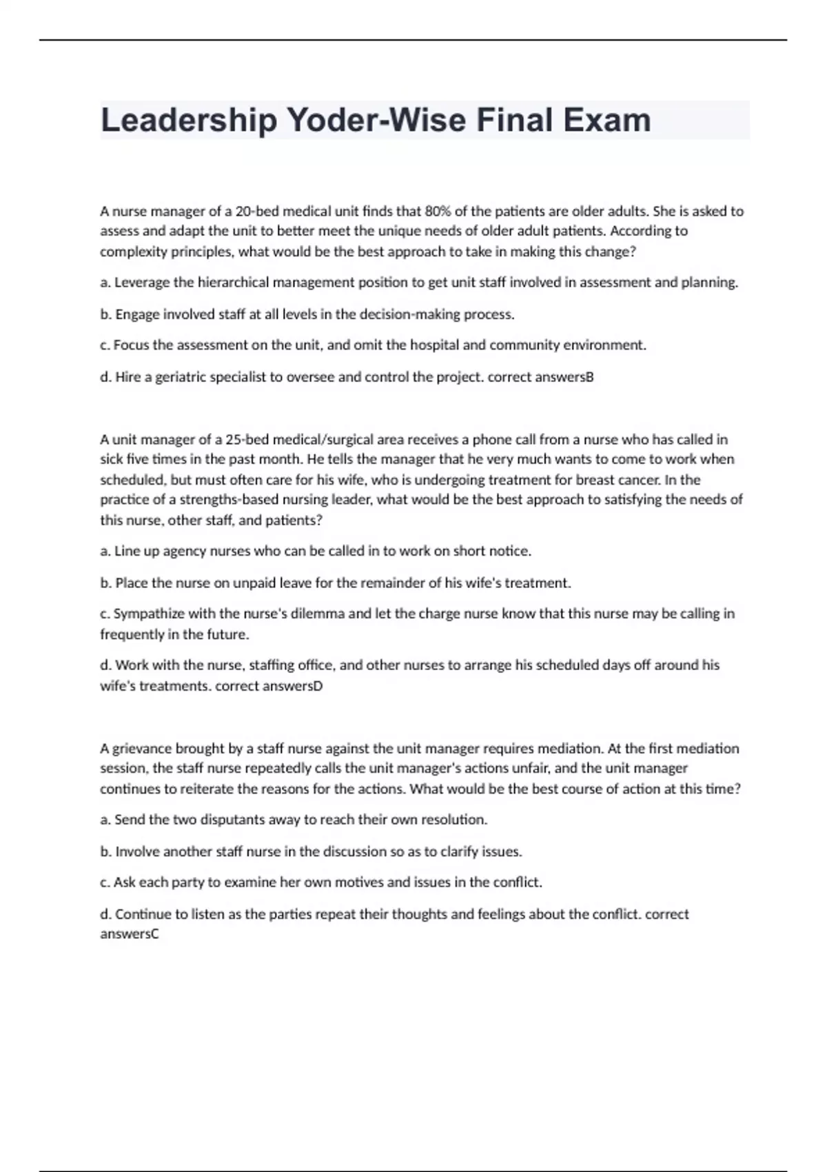 Leadership Yoder-Wise Final Exam 2024 with 100% correct answers