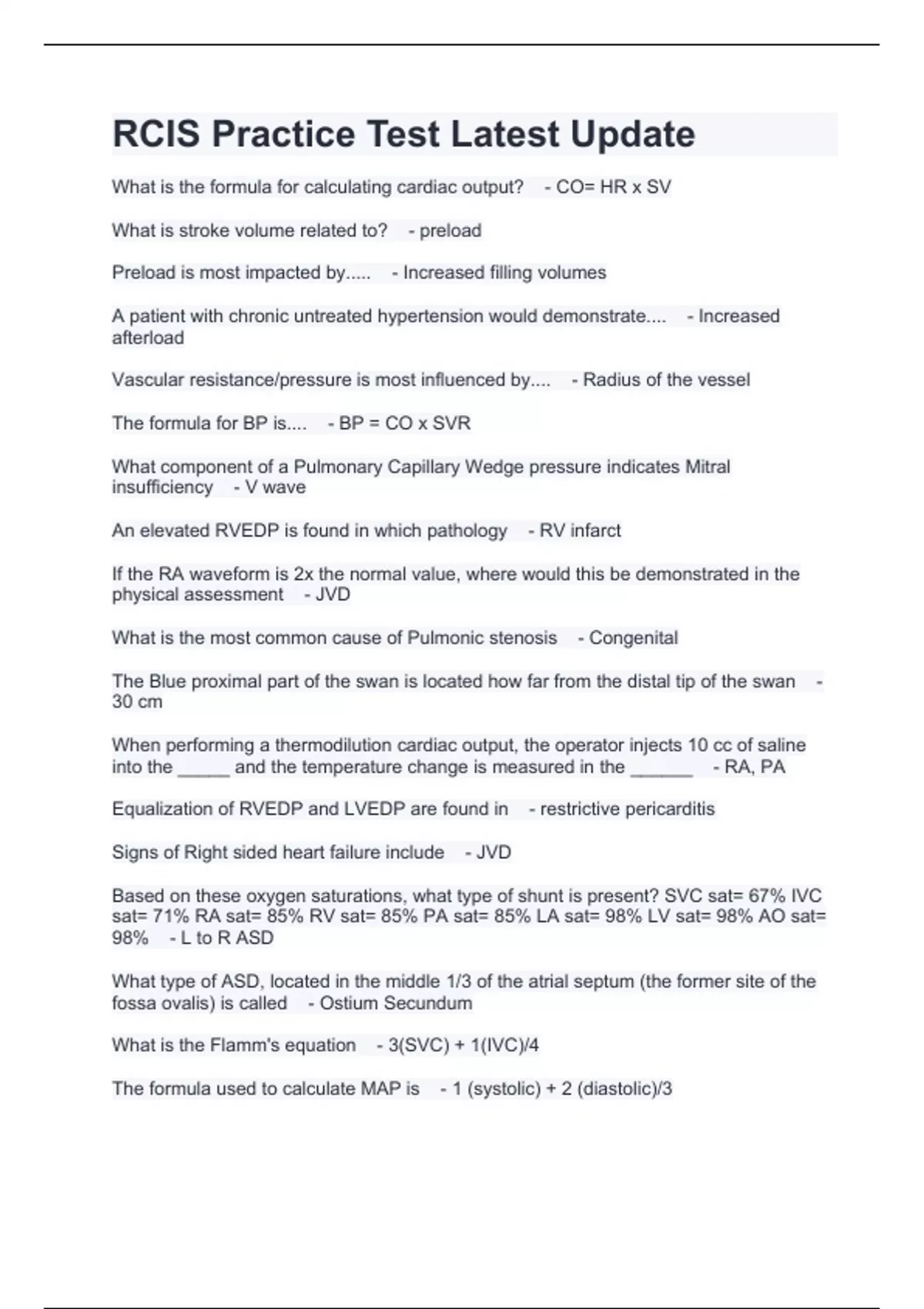 What is the formula for calculating cardiac output? - CO= HR x SV What is stroke volume related to? - preload Preload is most impacted by..... - Increased filling volumes A patient with chronic untreated hypertension would demonstrate.... - Increased afterload Vascular resistance/pressure is most influenced by.... - Radius of the vessel The formula for BP is.... - BP = CO x SVR What component of a Pulmonary Capillary Wedge pressure indicates Mitral insufficiency - V wave An elevated RVEDP is found in which pathology - RV infarct If the RA waveform is 2x the normal value, where would this be demonstrated in the physical assessment - JVD What is the most common cause of Pulmonic stenosis - Congenital The Blue proximal part of the swan is located how far from the distal tip of the swan - 30 cm When performing a thermodilution cardiac output, the operator injects 10 cc of saline into the _____ and the temperature change is measured in the ______ - RA, PA Equalization of RVEDP and LVEDP are found in - restrictive pericarditis Signs of Right sided heart failure include - JVD Based on these oxygen saturations, what type of shunt is present? SVC sat= 67% IVC sat= 71% RA sat= 85% RV sat= 85% PA sat= 85% LA sat= 98% LV sat= 98% AO sat= 98% - L to R ASD What type of ASD, located in the middle 1/3 of the atrial septum (the former site of the fossa ovalis) is called - Ostium Secundum What is the Flamm's equation - 3(SVC) + 1(IVC)/4 The formula used to calculate MAP is - 1 (systolic) + 2 (diastolic)/3 What are the four anomalies associated with Tetralogy of Fallot - Pulmonic stenosis, over riding aorta, RVH, VSD Which fetal anomaly is characterized by a large VSD over which a large single great vessel arises - Truncas Arteriosus Pulsus Paradoxus is a sign of - Cardiac Tamponade What does RAD stand for - Radiation absorbed dose What component of the X-ray system converts light rays into images - Image intensifier What is the maximum annual dose of radiation one can receive annually - 5 REM Lead protection should be at least how many millimeters of lead - .5 What is the minimum safe distance to position oneself from the X-ray source - 6 feet In an X-ray tube what is the charge on the cathode and the anode - Cathode: positive Anode: negative Which view exposes the operator to the greatest amount of radiation - Lateral What converts x-rays into an image - Image Intensifier The contrast that is best for a patient is - low osmolality Radiolucent means - X-rays are permitted to pass through Radiopaque means - X-rays are not permitted to pass through ReoPro works on - IIb/IIIa receptors Heparin potentiates the action of - Antithrombin Fibrinogen is converted to Fibrin by the action of - Thrombin There are _________ known pathways to imitate the clotting cascade - 2 Aspirin inhibits the action of - Arachidonic Acid Which agent is not an antiplatelet - Heparin