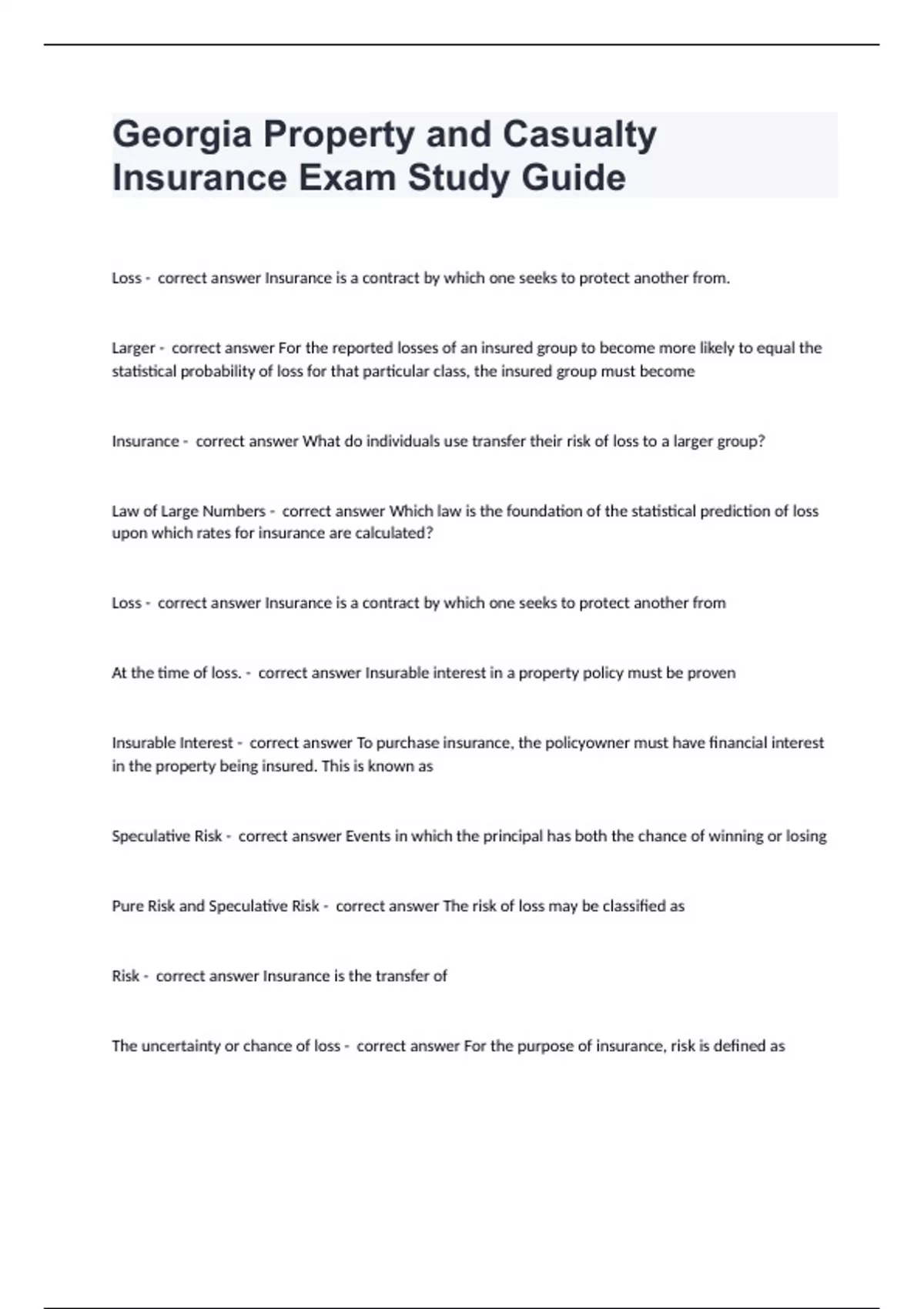Georgia Property and Casualty Insurance Exam Study GuideLoss - correct answer Insurance is a contract by which one seeks to protect another from. Larger - correct answer For the reported losses of an insured group to become more likely to equal the statistical probability of loss for that particular class, the insured group must become Insurance - correct answer What do individuals use transfer their risk of loss to a larger group? Law of Large Numbers - correct answer Which law is the foundation of the statistical prediction of loss upon which rates for insurance are calculated? Loss - correct answer Insurance is a contract by which one seeks to protect another from At the time of loss. - correct answer Insurable interest in a property policy must be proven Insurable Interest - correct answer To purchase insurance, the policyowner must have financial interest in the property being insured. This is known as Speculative Risk - correct answer Events in which the principal has both the chance of winning or losing Pure Risk and Speculative Risk - correct answer The risk of loss may be classified as Risk - correct answer Insurance is the transfer of The uncertainty or chance of loss - correct answer For the purpose of insurance, risk is defined as