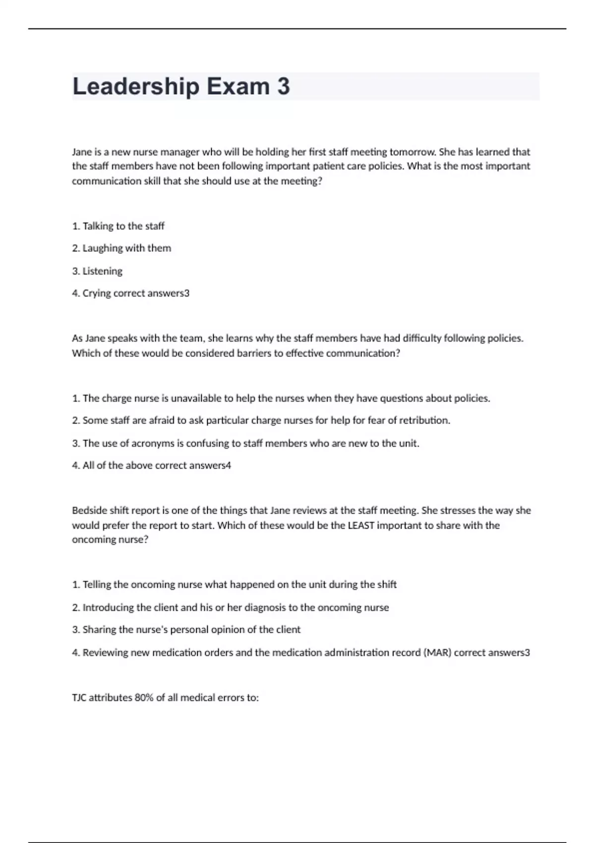 Jane is a new nurse manager who will be holding her first staff meeting tomorrow. She has learned that the staff members have not been following important patient care policies. What is the most important communication skill that she should use at the meeting? 1. Talking to the staff 2. Laughing with them 3. Listening 4. Crying correct answers3 As Jane speaks with the team, she learns why the staff members have had difficulty following policies. Which of these would be considered barriers to effective communication? 1. The charge nurse is unavailable to help the nurses when they have questions about policies. 2. Some staff are afraid to ask particular charge nurses for help for fear of retribution. 3. The use of acronyms is confusing to staff members who are new to the unit. 4. All of the above correct answers4 Bedside shift report is one of the things that Jane reviews at the staff meeting. She stresses the way she would prefer the report to start. Which of these would be the LEAST important to share with the oncoming nurse? 1. Telling the oncoming nurse what happened on the unit during the shift 2. Introducing the client and his or her diagnosis to the oncoming nurse 3. Sharing the nurse's personal opinion of the client 4. Reviewing new medication orders and the medication administration record (MAR) correct answers3 TJC attributes 80% of all medical errors to: