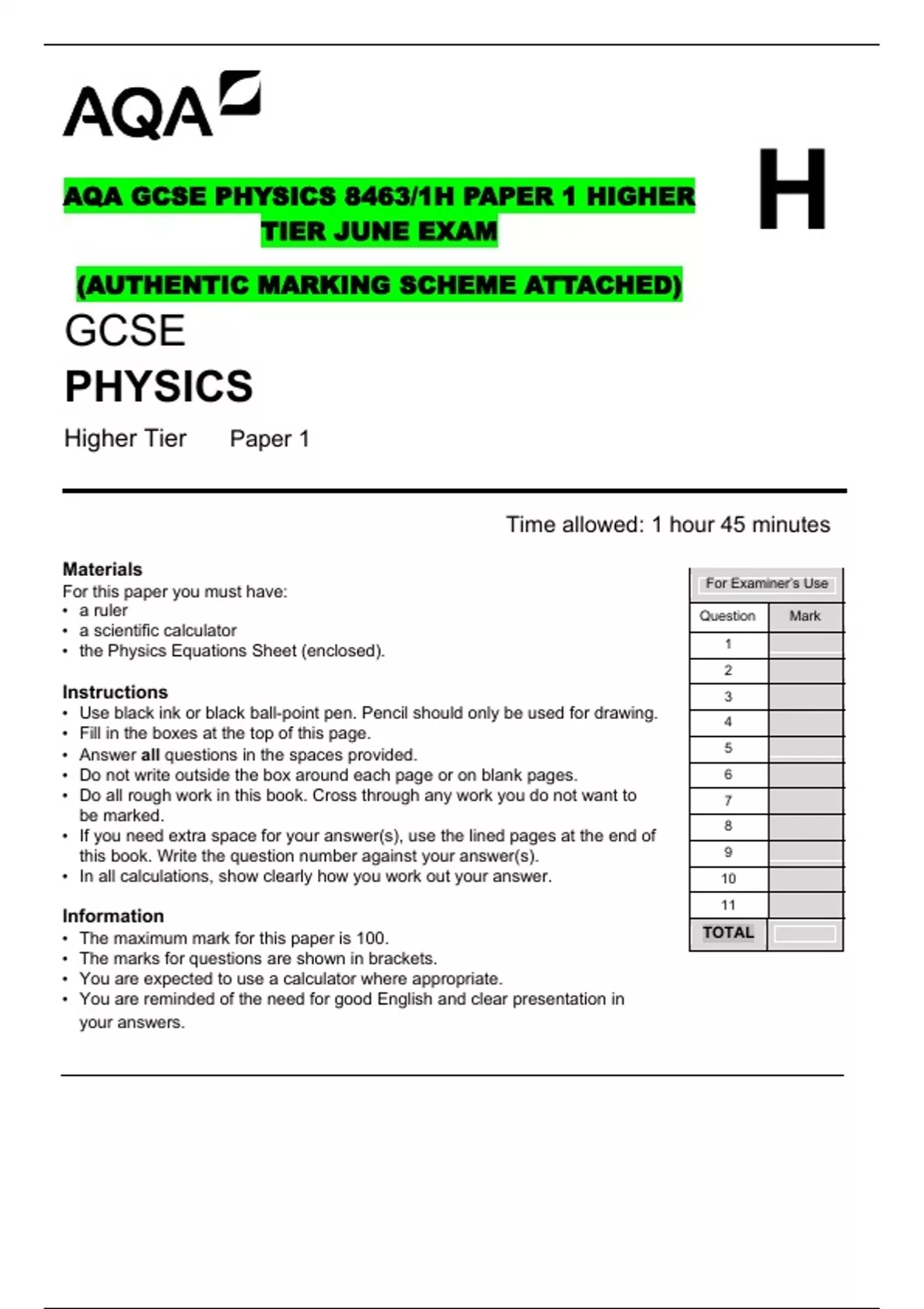 AQA GCSE PHYSICS 8463/1H PAPER 1 HIGHER TIER JUNE EXAM (AUTHENTIC MARKING SCHEME ATTACHED)