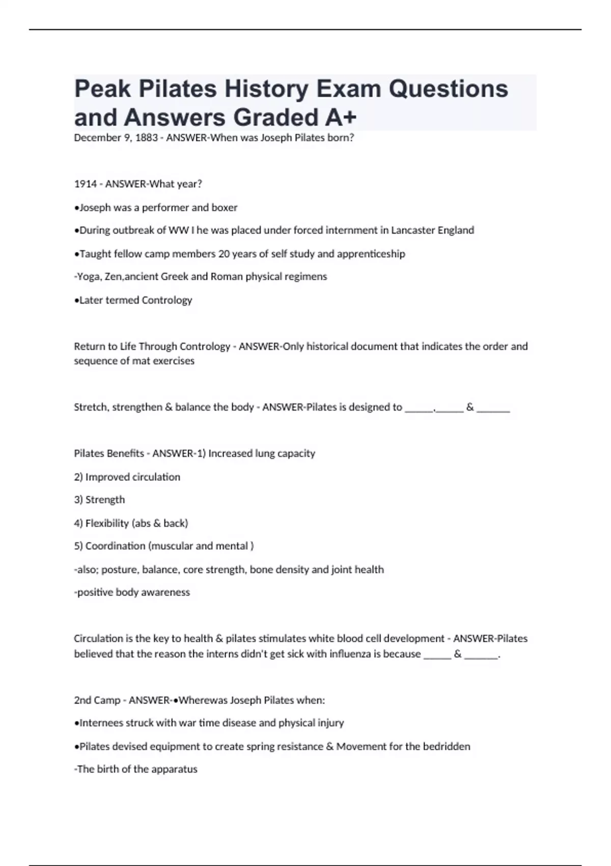 December 9, 1883 - ANSWER-When was Joseph Pilates born? 1914 - ANSWER-What year? •Joseph was a performer and boxer •During outbreak of WW I he was placed under forced internment in Lancaster England •Taught fellow camp members 20 years of self study and apprenticeship -Yoga, Zen,ancient Greek and Roman physical regimens •Later termed Contrology Return to Life Through Contrology - ANSWER-Only historical document that indicates the order and sequence of mat exercises Stretch, strengthen & balance the body - ANSWER-Pilates is designed to _____,_____ & ______ Pilates Benefits - ANSWER-1) Increased lung capacity 2) Improved circulation 3) Strength 4) Flexibility (abs & back) 5) Coordination (muscular and mental ) -also; posture, balance, core strength, bone density and joint health -positive body awareness Circulation is the key to health & pilates stimulates white blood cell development - ANSWER-Pilates believed that the reason the interns didn't get sick with influenza is because _____ & ______. 2nd Camp - ANSWER-•Wherewas Joseph Pilates when: •Internees struck with war time disease and physical injury •Pilates devised equipment to create spring resistance &