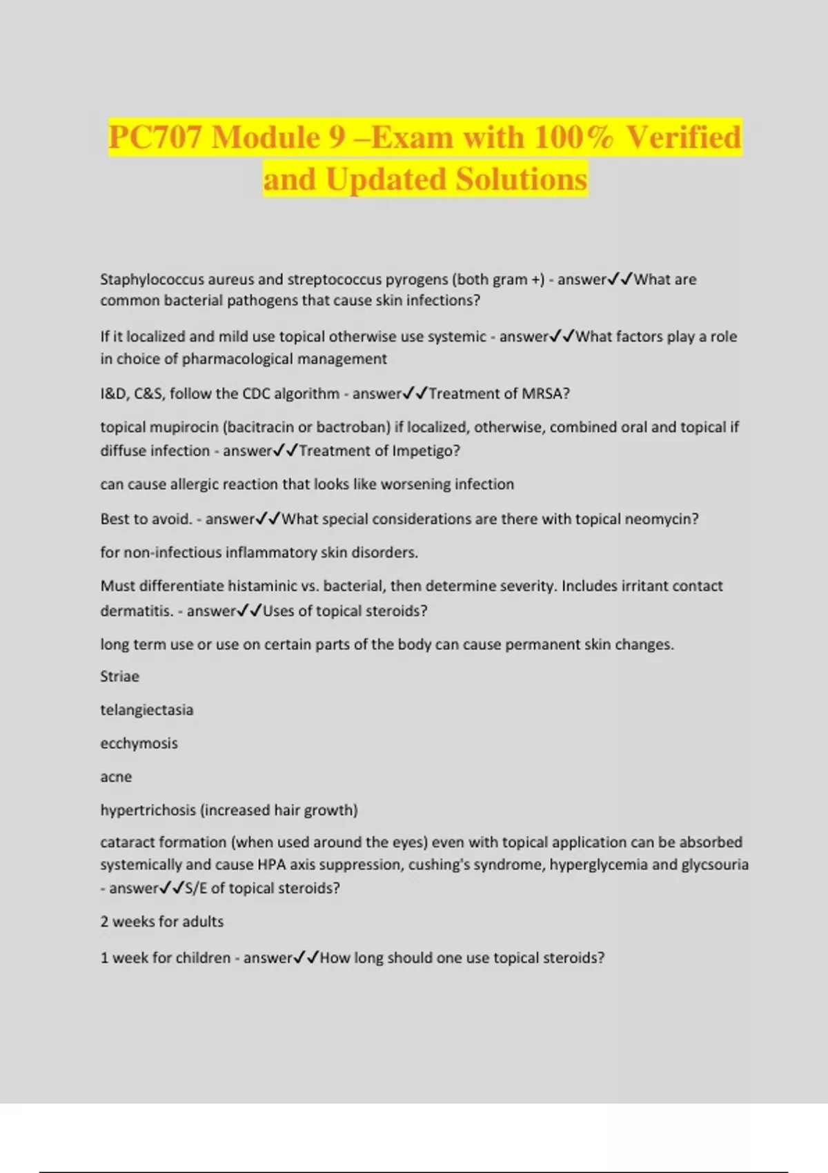 PC707 Module 9 –Exam with 100% Verified and Updated Solutions Staphylococcus aureus and streptococcus pyrogens (both gram +) - answerWhat are common bacterial pathogens that cause skin infections? If it localized and mild use topical otherwise use systemic - answerWhat factors play a role in choice of pharmacological management I&D, C&S, follow the CDC algorithm - answerTreatment of MRSA? topical mupirocin (bacitracin or bactroban) if localized, otherwise, combined oral and topical if diffuse infection - answerTreatment of Impetigo? can cause allergic reaction that looks like worsening infection Best to avoid. - answerWhat special considerations are there with topical neomycin? for non-infectious inflammatory skin disorders. Must differentiate histaminic vs. bacterial, then determine severity. Includes irritant contact dermatitis. - answerUses of topical steroids? long term use or use on certain parts of the body can cause permanent skin changes. Striae telangiectasia ecchymosis acne hypertrichosis (increased hair growth) cataract formation (when used around the eyes) even with topical application can be absorbed systemically and cause HPA axis suppression, cushing's syndrome, hyperglycemia and glycsouria - answerS/E of topical steroids? 2 weeks for adults 1 week for children - answerHow long should one use topical steroids? use lowest potency for permeable areas such as the face, groin or axilla - answerPrecuations with topical steroid use? fluorinated - answerWhat is stronger, fluorinated or non-fluorinated? gels and aerosols - answerWhat type of topical steroid is good for hairy areas? 1. ointment/emollient- anywhere hard to get to, plaques, elbows, soles palms 2. creams- less greasy, water based and more drying. 3. lotions- dilute creams. 4. Solutions- alcohol based, scalp, drying - answerWhat are the 4 types of topical steroids and in what situation are they used? creams - answerWhich type of topical steroid is good for weeping lesion or interiginous areas? potency selection based on age, area to be covered and severity - answerWhat information should you take into consideration when selecting the form of delivery of topical steroids? occlusive dressings including diapers - answerWhat type of dressings will increase the absorption of topical steroids? the severity and it involves a step wise approach - answerWhat does the choice of acne medication depend on? skin care (wash face 2-3x/day, avoid cosmetics, water based moisturizer, perfume free, use ear buds when on phone, change pillow case regularly) - answerWhat is the 1st line non pharmacologic treatment of acne? topical, incudes comedolytic agent (Retinoic Acid), a comedolytic bactericidal agent (Benzoyl peroxide), or a topical antibiotic (Clindamycin 2% or Erythromycin 2-3%), keratolytic agents - answerWhat is the 1st line pharmacologic treatment of acne? 4-6 weeks - answerHow long does it take to see improvement with 1st line medications to treat acne? oral abx ( tetracyclines, clindamycin, erythromycin). Use erythromycin if tetracycline failes or if patient may be pregnant Retin A OCPs - answerWhat are the 2nd line medications to treat acne? Must be 15 yo 4-6 months - answerHow old must one be to use OCPs for acne treatment and how to see results