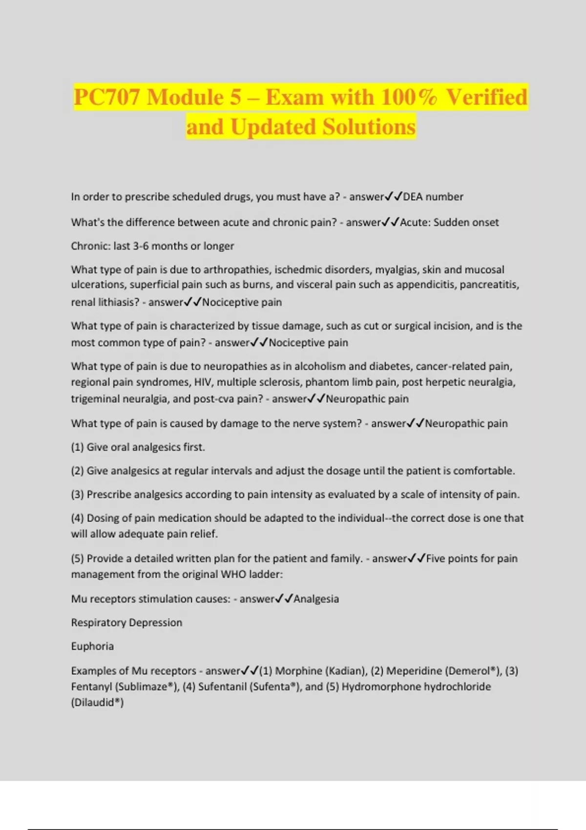 PC707 Module 5 – Exam with 100% Verified and Updated Solutions In order to prescribe scheduled drugs, you must have a? - answerDEA number What's the difference between acute and chronic pain? - answerAcute: Sudden onset Chronic: last 3-6 months or longer What type of pain is due to arthropathies, ischedmic disorders, myalgias, skin and mucosal ulcerations, superficial pain such as burns, and visceral pain such as appendicitis, pancreatitis, renal lithiasis? - answerNociceptive pain What type of pain is characterized by tissue damage, such as cut or surgical incision, and is the most common type of pain? - answerNociceptive pain What type of pain is due to neuropathies as in alcoholism and diabetes, cancer-related pain, regional pain syndromes, HIV, multiple sclerosis, phantom limb pain, post herpetic neuralgia, trigeminal neuralgia, and post-cva pain? - answerNeuropathic pain What type of pain is caused by damage to the nerve system? - answerNeuropathic pain (1) Give oral analgesics first. (2) Give analgesics at regular intervals and adjust the dosage until the patient is comfortable. (3) Prescribe analgesics according to pain intensity as evaluated by a scale of intensity of pain. (4) Dosing of pain medication should be adapted to the individual--the correct dose is one that will allow adequate pain relief. (5) Provide a detailed written plan for the patient and family. - answerFive points for pain management from the original WHO ladder: Mu receptors stimulation causes: - answerAnalgesia Respiratory Depression Euphoria Examples of Mu receptors - answer(1) Morphine (Kadian), (2) Meperidine (Demerol®), (3) Fentanyl (Sublimaze®), (4) Sufentanil (Sufenta®), and (5) Hydromorphone hydrochloride (Dilaudid®) Kappa receptors stimulation causes: - answerAnalgesia Sedation Examples of Kappa receptors - answerNubain & Stadol Delta receptor stimulation causes: - answerDysphoria Hallucinations Sigma receptor stimulation causes: - answerDysphoria Hallucinations Mu and Kappa receptors cause: - answeranalgesia Delta and Sigma receptors cause 2 things: - answerDysphoria Hallucinations The drugs that stimulate the Mu receptor all stimulate the _________ receptor to some extent - answerKappa Full agonists are opioids that bind to _____ receptors in the brain - answerMu Strong Agonists: - answerMorphine (Kadian), hydromorphone, oxymorphone, heroin, meperidine (Demerol), methadone (Dolophine), fentanyl (Sublimaze), and sufentanil (Sufenta) Moderate Agonists: - answerCodeine (Tylenol with Codeine), propoxyphene (Darvon), oxycodone, hydrocodone Why it is harder to abuse partial agonist than full agonist - answerPartial agonist binds primarily to mu opioid receptors and cause them to produce endorphins, but to a much lesser extent than full agonists. Increasing the dose of partial agonists results in much smaller increase in endorphin release if any. Partial agonists have a lower/higher affinity for the receptor sites than full agonist? - answerHigher What happens when you give someone who is addicted and using a full agonist a partial agonist? When used in the treatment of addiction do not begin the partial agonist until withdrawal from the opioid has begun. - answerCan trigger withdraw
